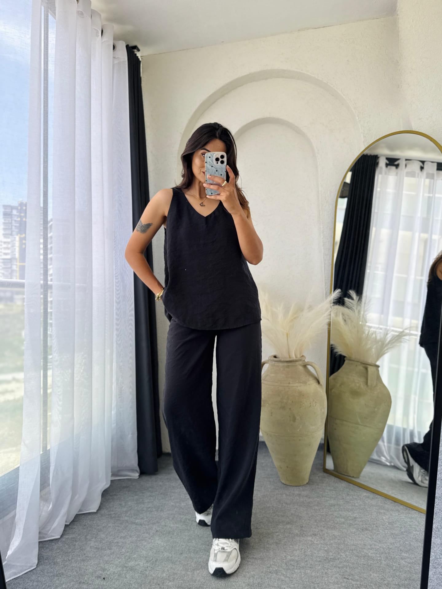 bluz kalın askılı salaş kesimdir pantolon yüksekbel beli lastikli ceplidir