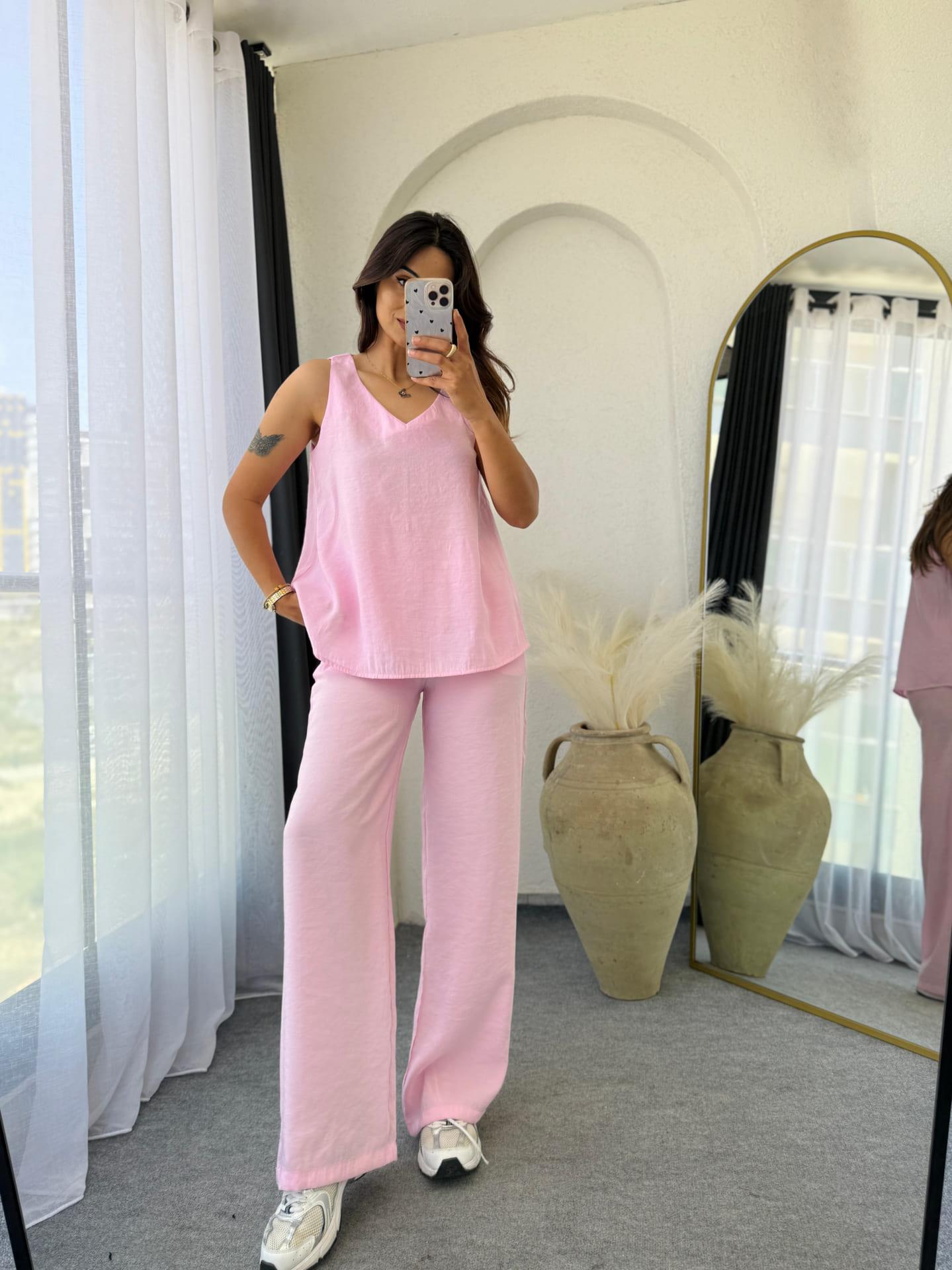 bluz kalın askılı salaş kesimdir pantolon yüksekbel beli lastikli ceplidir
