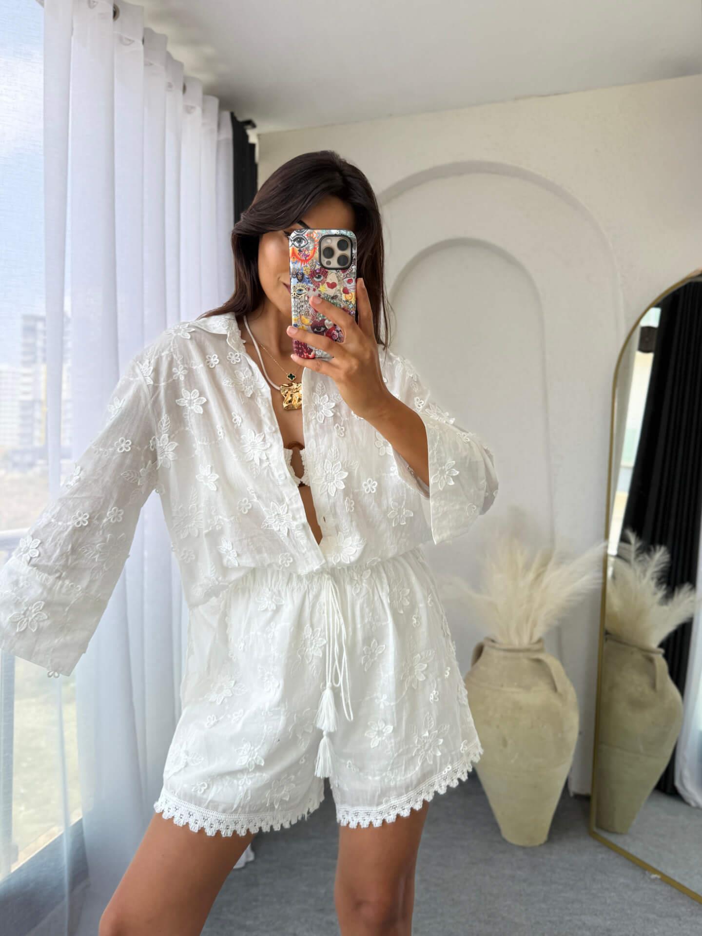 3 boyutlu şort takımı, lüks kalitesi ve dantel detaylarıyla göz kamaştırıyor. Astarlı şortu ve oversize gömlek kesimiyle rahatlığı ve şıklığı bir arada sunuyor. Her adımda farkını hissedeceğin bu şık takım, tarzına ayrı bir hava katacak.