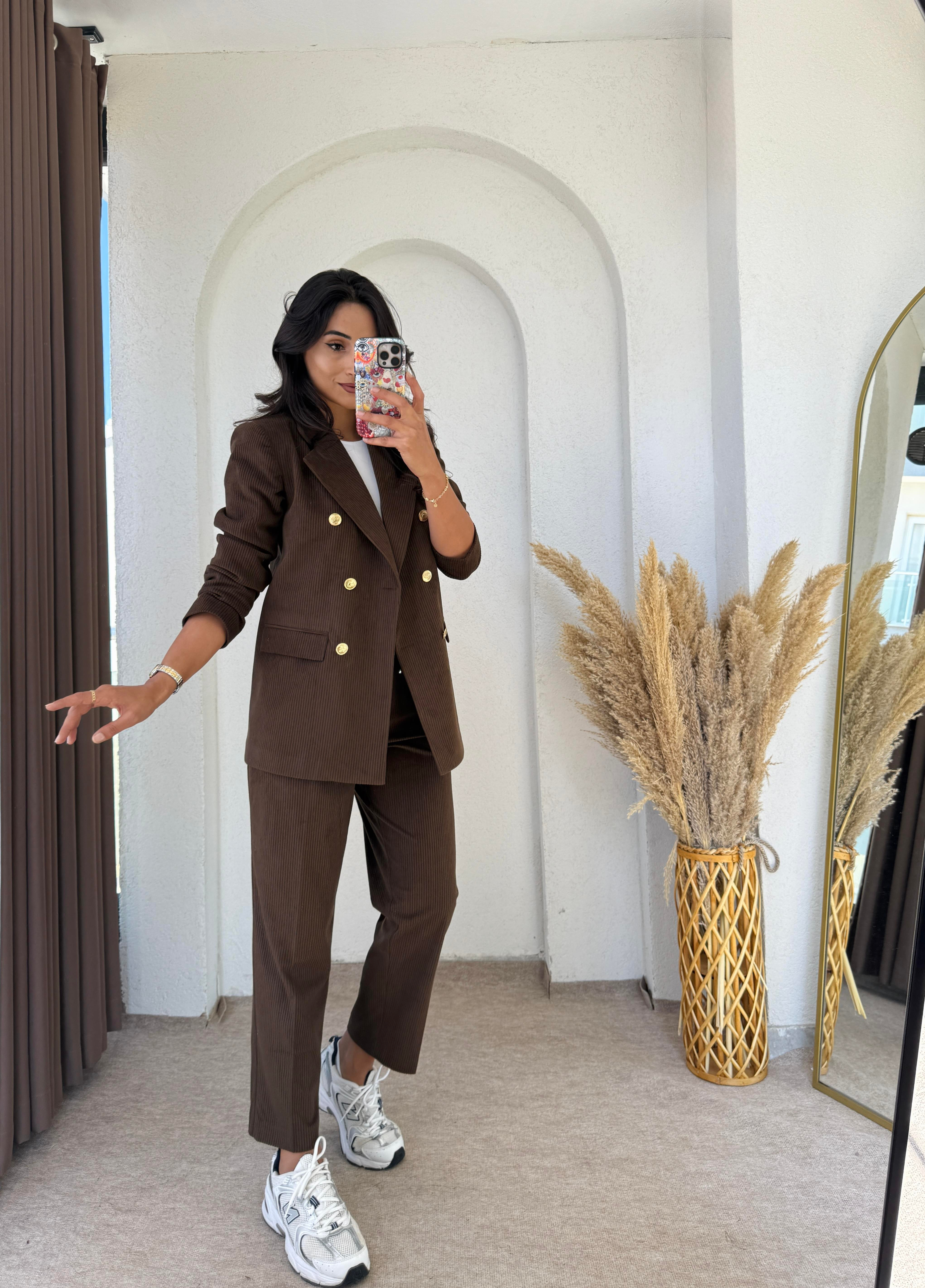 Zarif kadife dokusu ve ışıltılı gold düğme detaylarıyla öne çıkan BYMN Kadife Takım, şıklığı ve sofistike duruşu bir araya getiriyor.