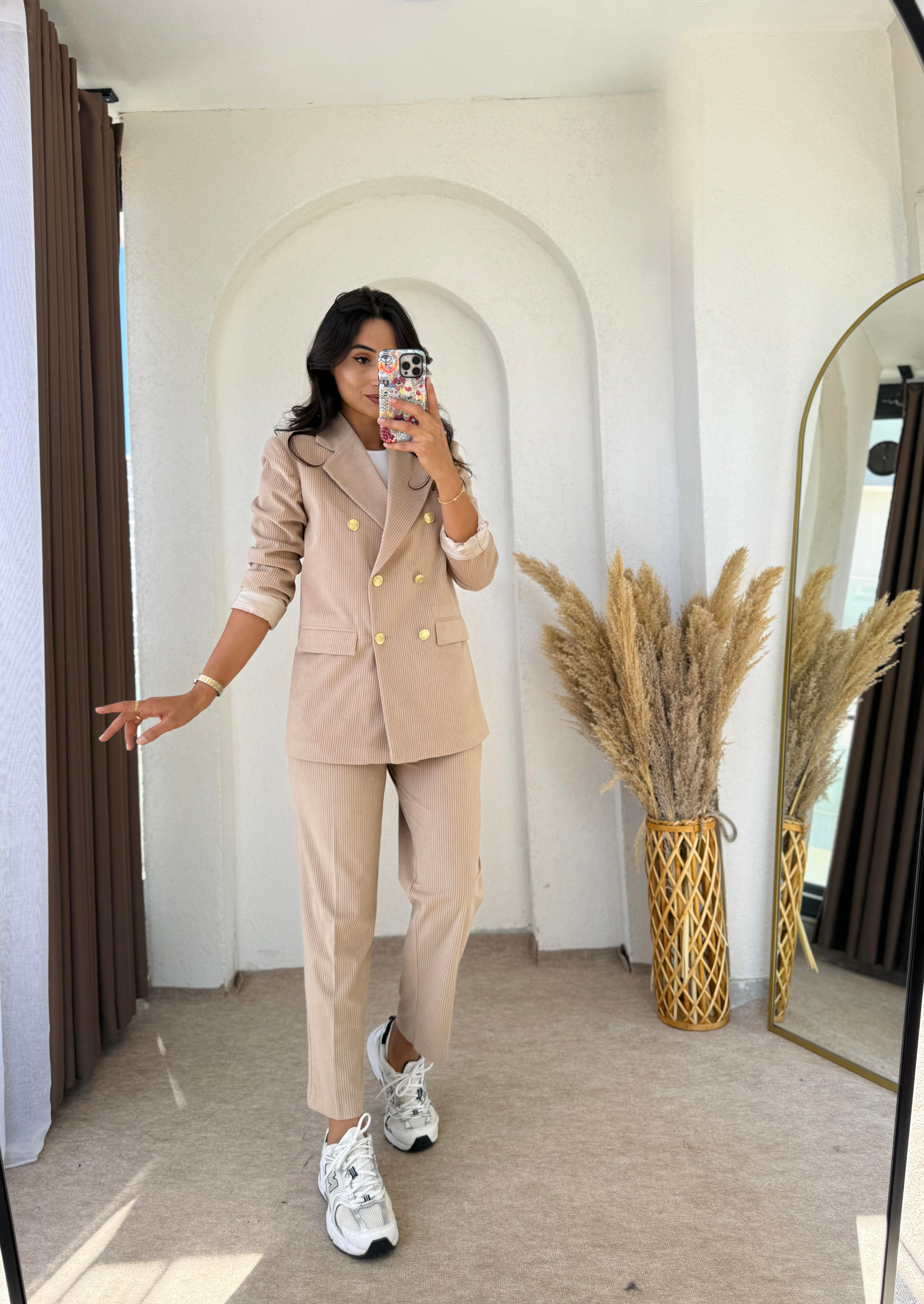Zarif kadife dokusu ve ışıltılı gold düğme detaylarıyla öne çıkan BYMN Kadife Takım, şıklığı ve sofistike duruşu bir araya getiriyor.