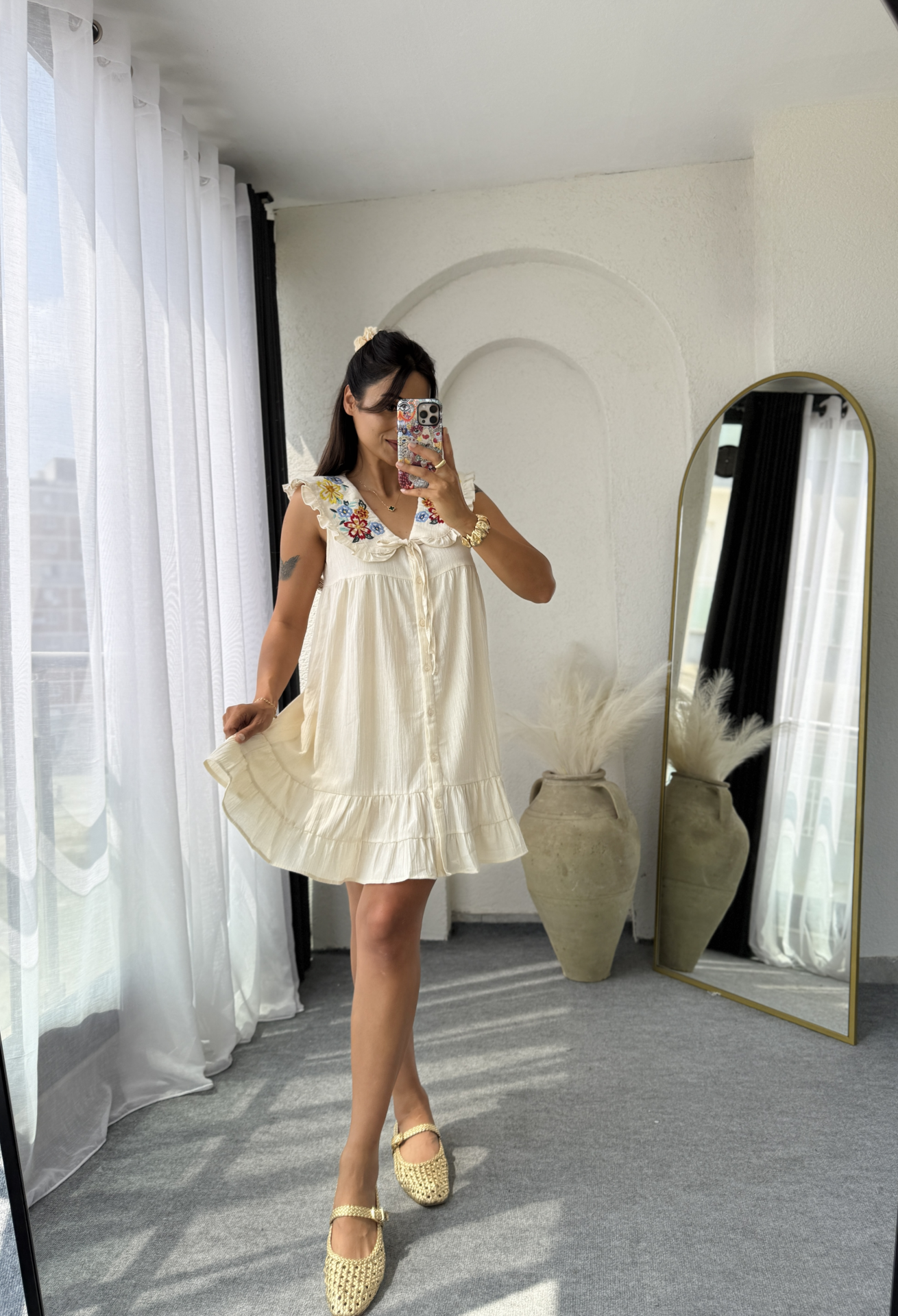 Ham keten kumaştır yaka kısmı bebe yaka fırfırlı çiçek motif  işleme detaylıdır.Önden komple düğmeli etek ucu fırfırlıdır astarsızdır nude tonlarında boxer yada ek astar ile kullanıma uygundur