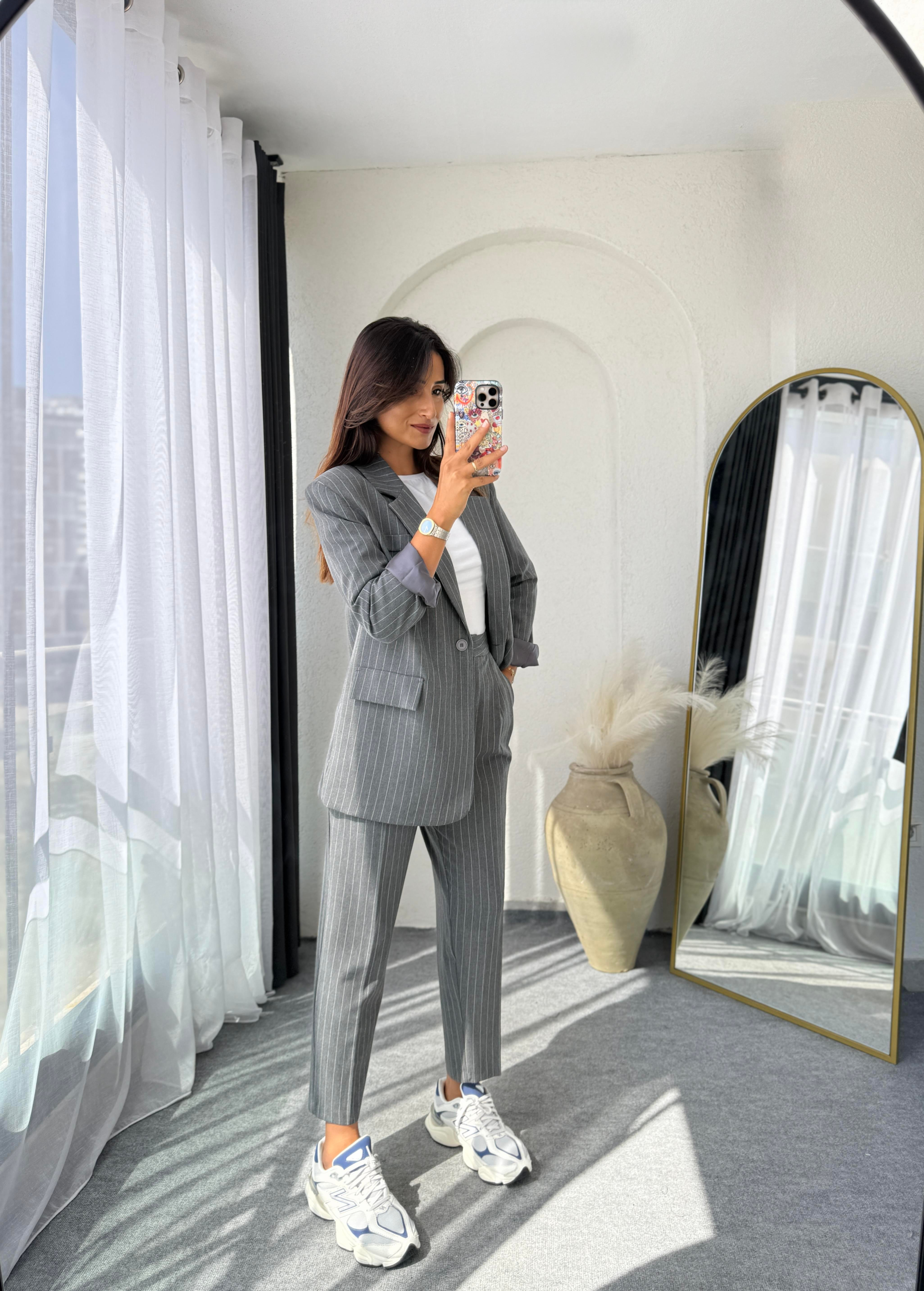 Pamuk poliviskon kumaştan üretilmiş oversize kesime sahip blazerı ve havuç kesim basen gizleyen yüksek bel pantolonuyla hem şık hem de rahat bir görünüm elde edebilirsiniz. Zarif çizgili deseniyle her tarza uyum sağlar.