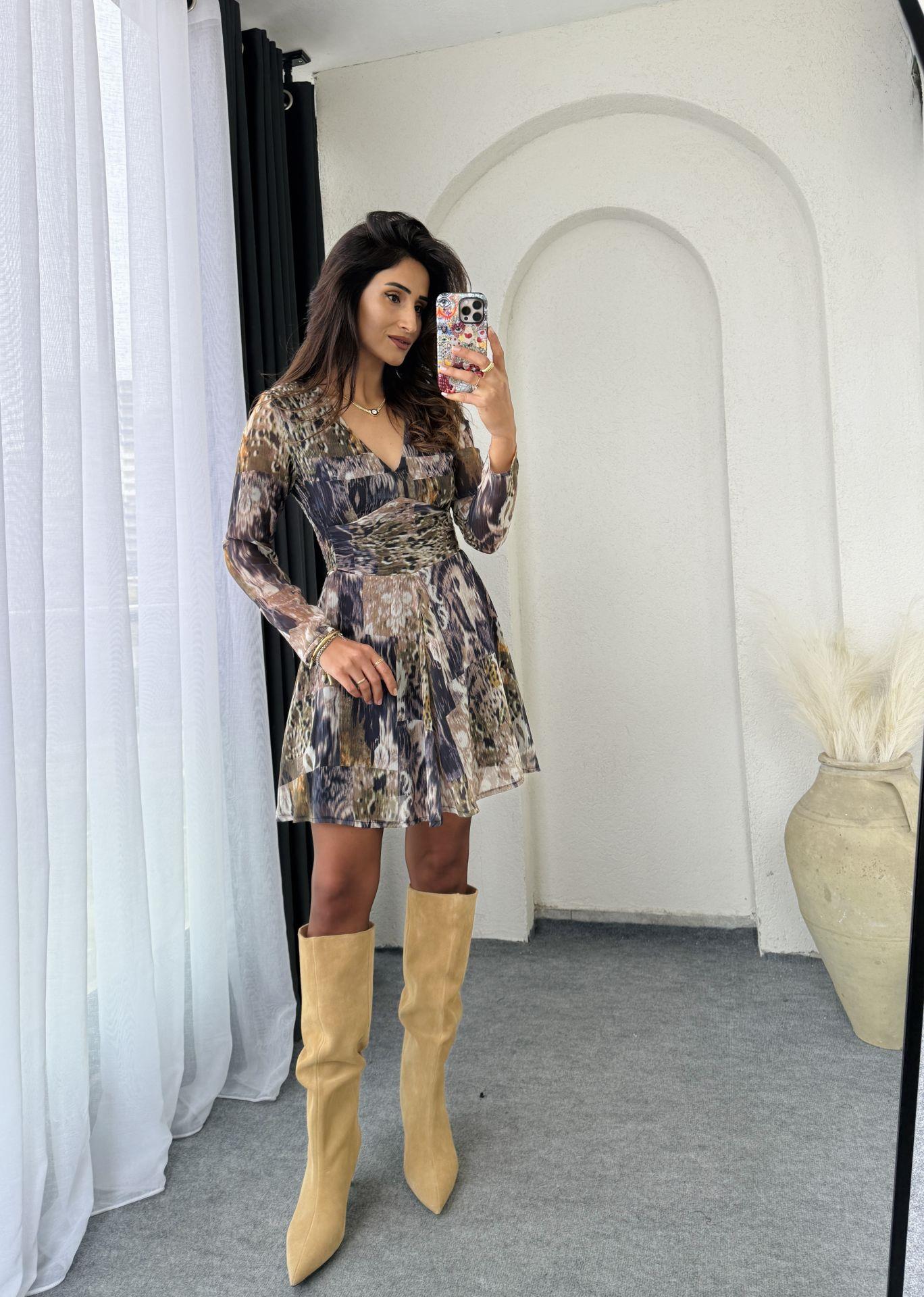 Şifon kumaş  içi astarlıdır V yaka arkadan fermuar kapamalı bel korse görünümlü yanlar lastiklidir