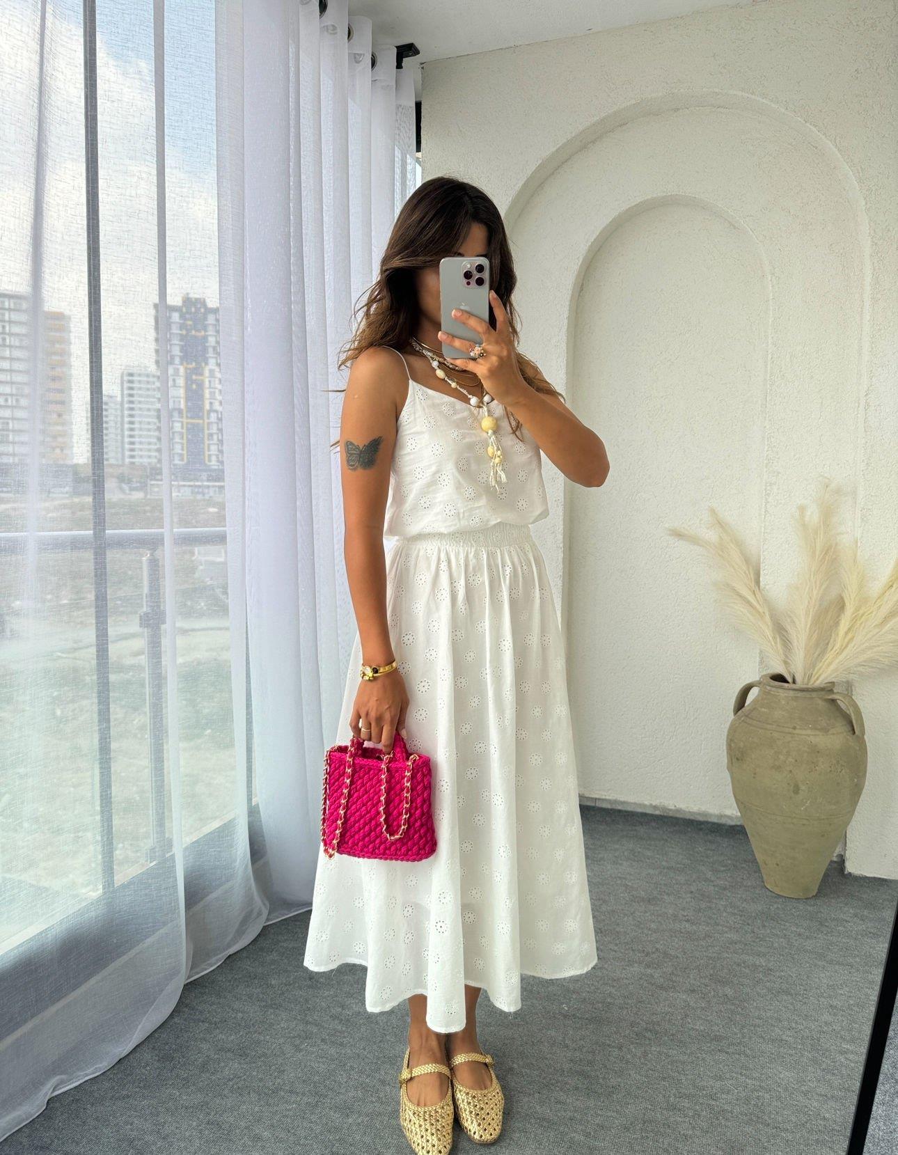 fisto pamuklu kumaş-etek beli lastikli içi astarlı-bluz lastik askılı içi astarlımanken 170/60kg çekimde S beden kullanılmıştır