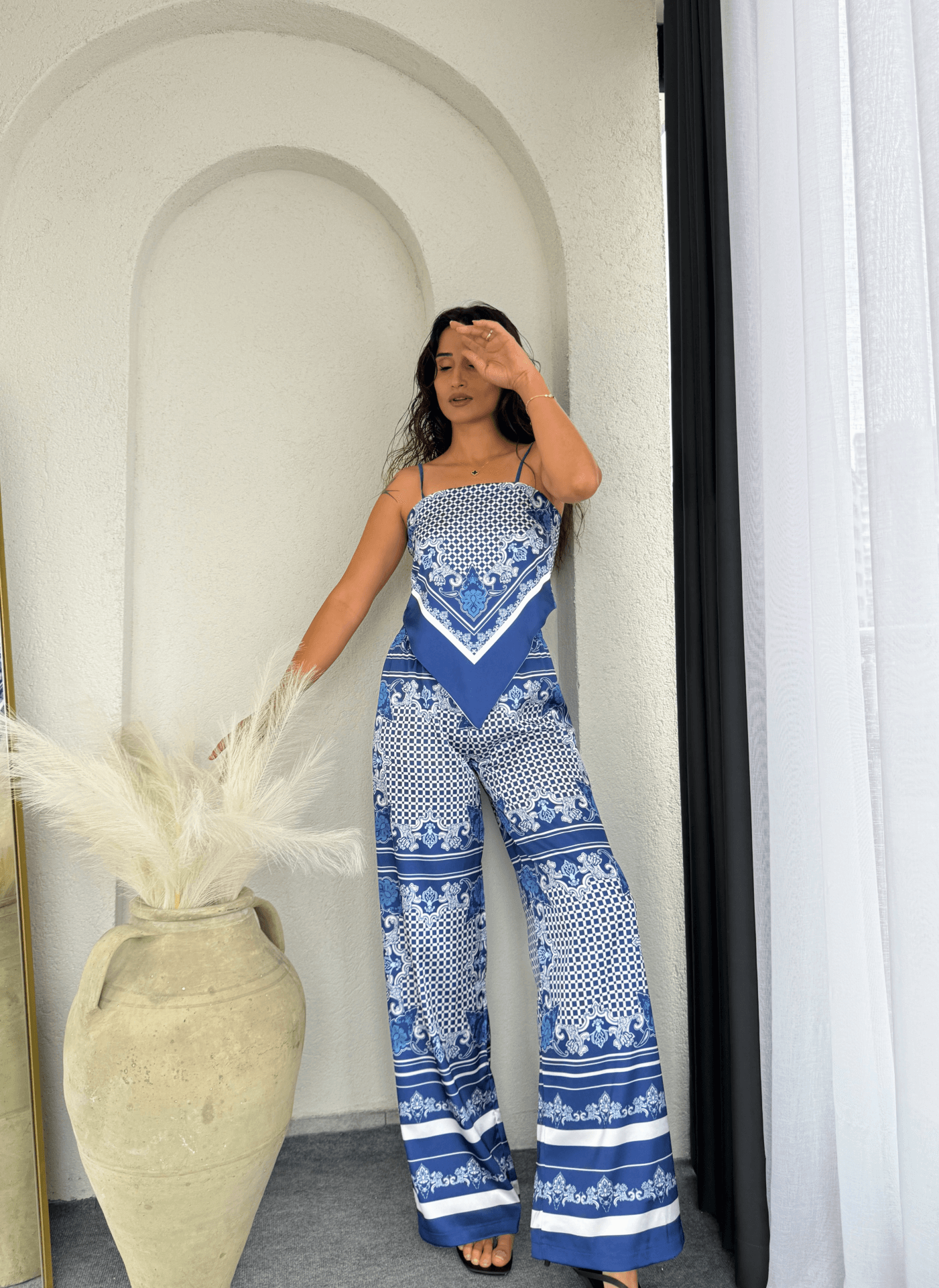 Etnik desenli saten kumaş Üst fular görünümlü önü V arka bağlama detaylı askılar asansörlüdür