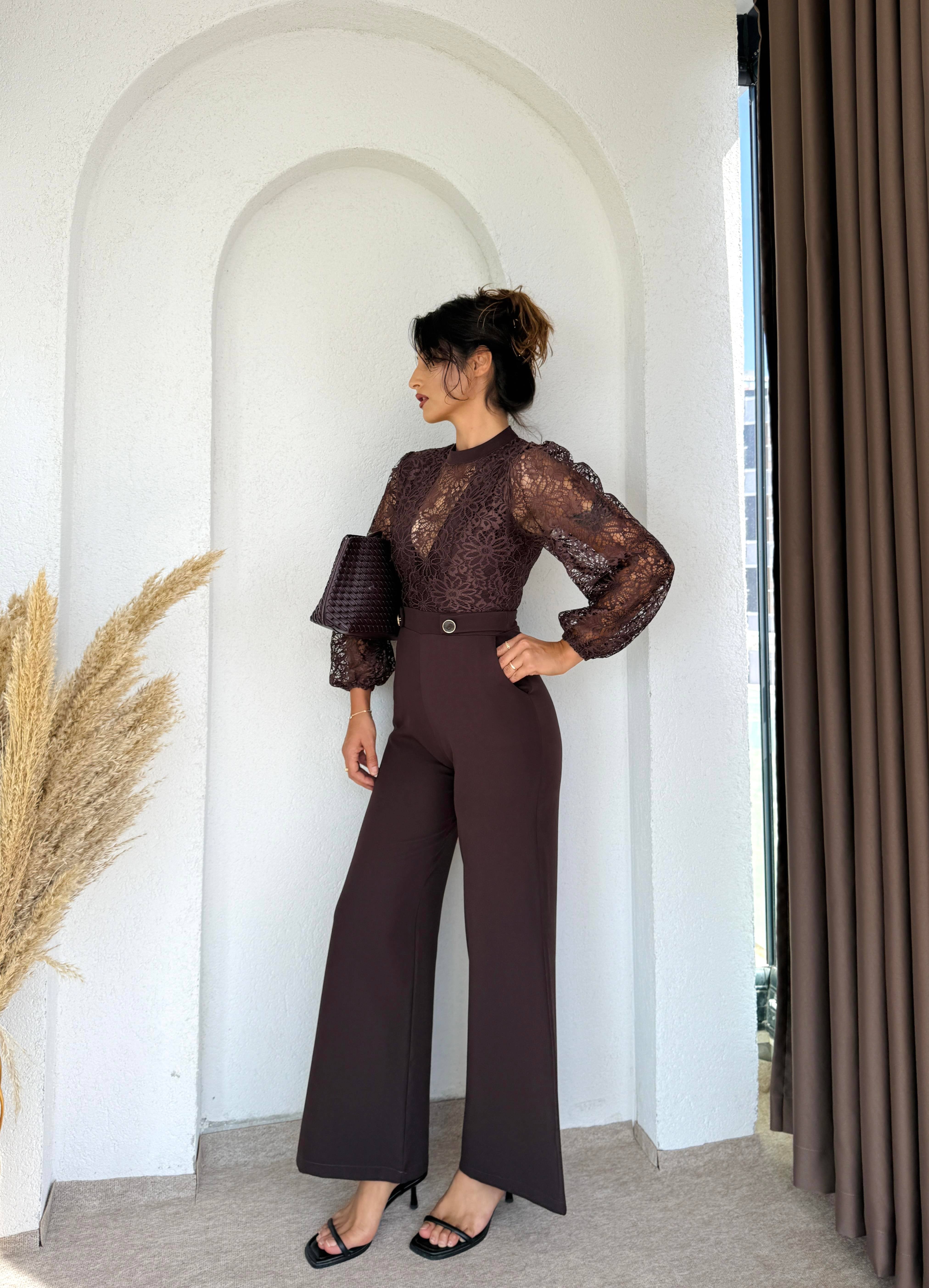 Bu zarif ve şık dantelli güpürlü tulum, özel davetlerinizde göz alıcı bir görünüm elde etmenizi sağlar. Şık detayları ve modern tasarımıyla dikkat çeken bu tulum, özgün tarzınızı ön plana çıkaracak. Elegan bir duruş sergilemek isteyenler için ideal bir seçimdir Tulum acıkahverengindedir arkadan fermuarlıdır üst parça içten V yaka astarlıdır kollar balon kol bilek lastiklidir