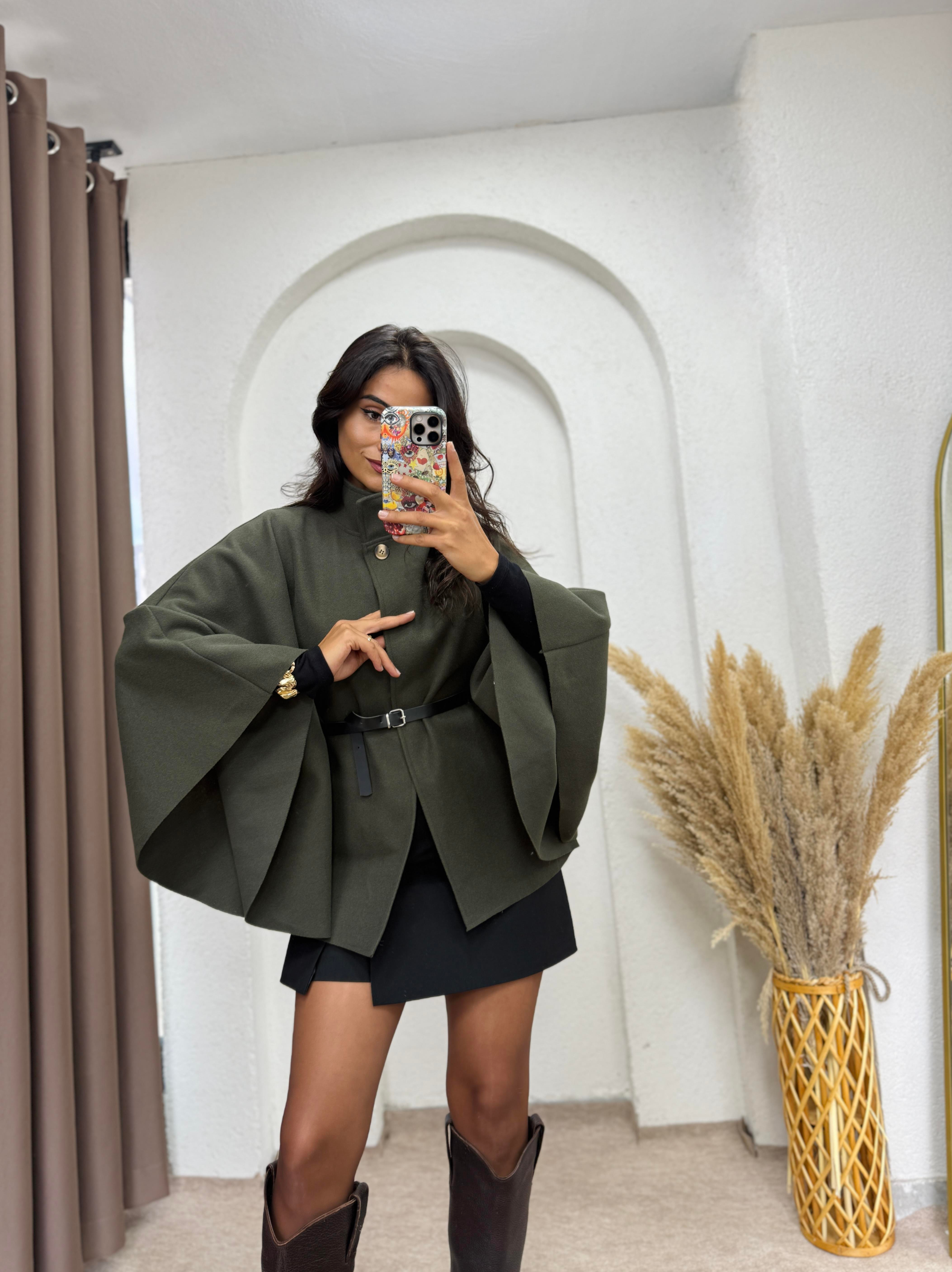 Kış stilinin en zarif parçalarından biri olan kemerli kaşe panço, hem sıcak tutan dokusu hem de modern kesimiyle dikkat çeker.