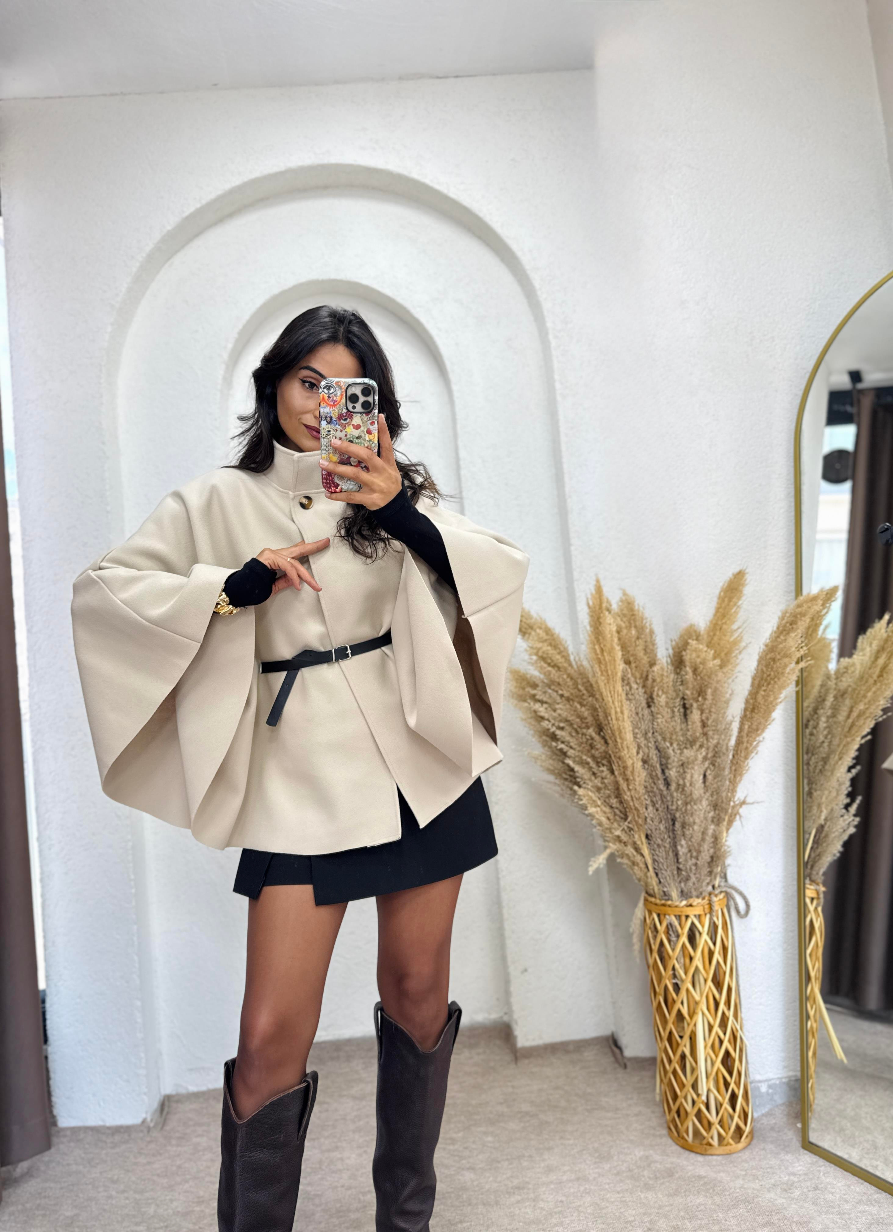Kış stilinin en zarif parçalarından biri olan kemerli kaşe panço, hem sıcak tutan dokusu hem de modern kesimiyle dikkat çeker.