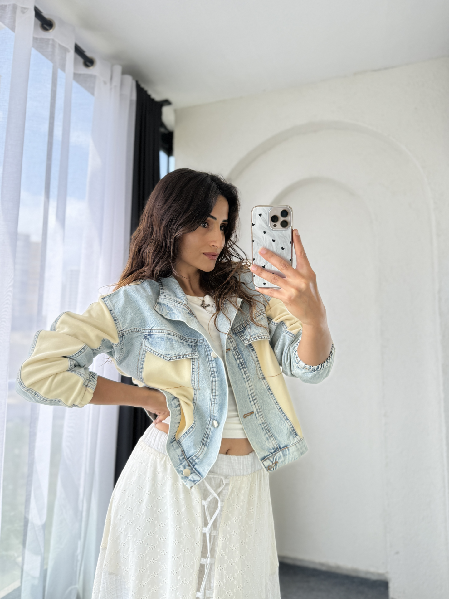 Bu muhteşem pamuklu kumaş garnili geçişli kot ceket, her dolabın vazgeçilmezi olmaya aday! Klasik ve şık tasarımı ile her tarza uyum sağlayan bu ceket, günün her anında rahatlıkla kullanabileceğiniz bir parça. Tarzınızı tamamlayacak kusursuz bir seçim