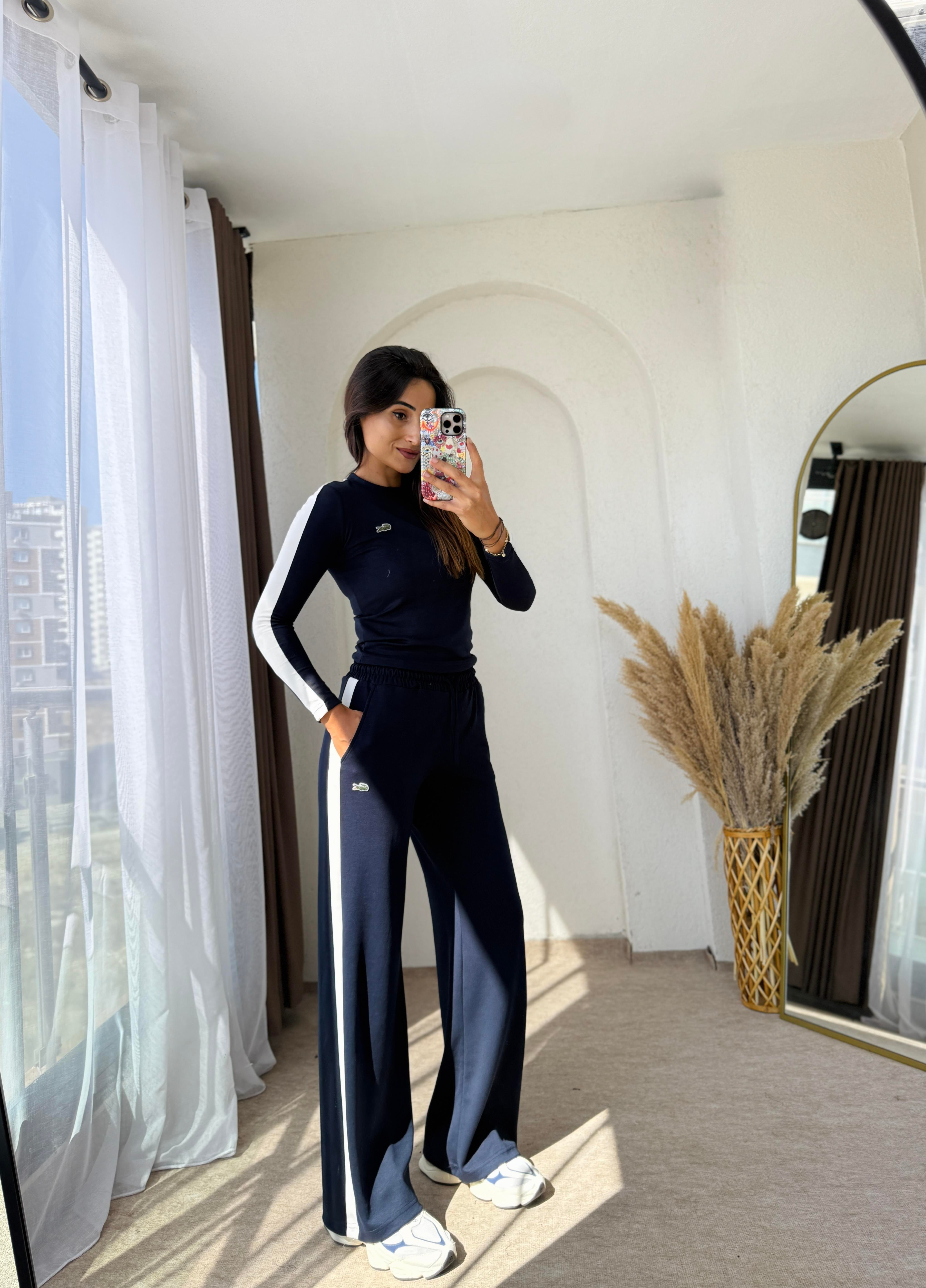 Modal kumaşa sahip eşofman takımı alt şerit detaylı yüksek bel beli lastikli yanları ceplidir üst sıfır yaka şerit detaylıdır Model 170/60kg çekimde S beden kullanılmıştır