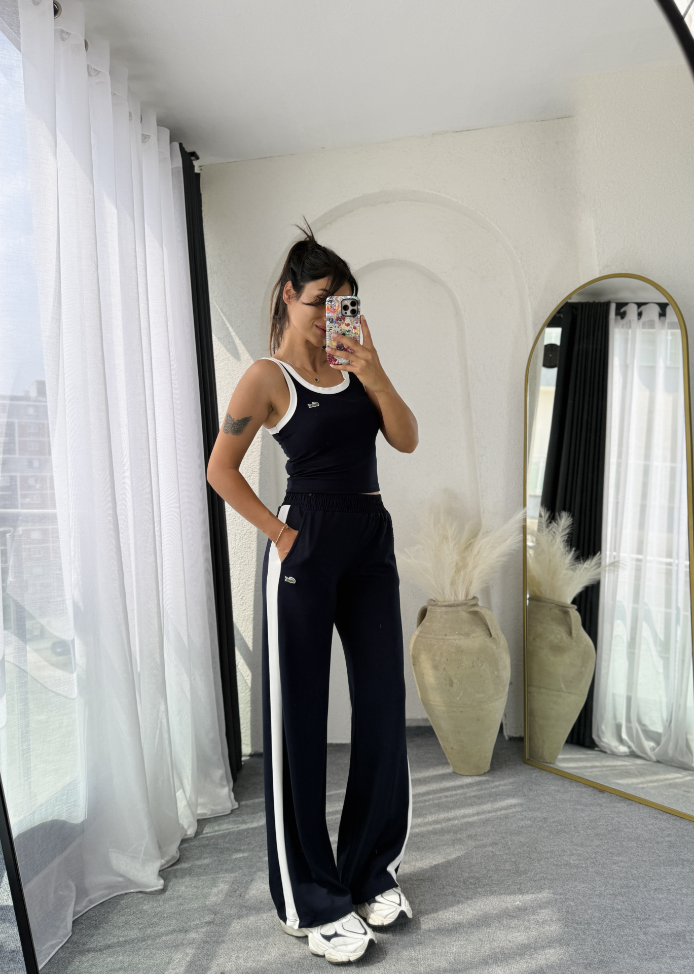 eşofman takımı, konforlu ve modern tarzıyla dikkat çekiyor. Modal kumaştan üretilmiş alt eşofman, likralı yapısıyla hareket özgürlüğü sunarken, beli lastikli ve cepli tasarımıyla kullanışlılık sağlıyor. Üst bluz ise kalın askılara sahip, şerit detaylarıyla ve şık görünümüyle öne çıkıyor. Şık ve rahat bir görünüm için ideal bir tercih!