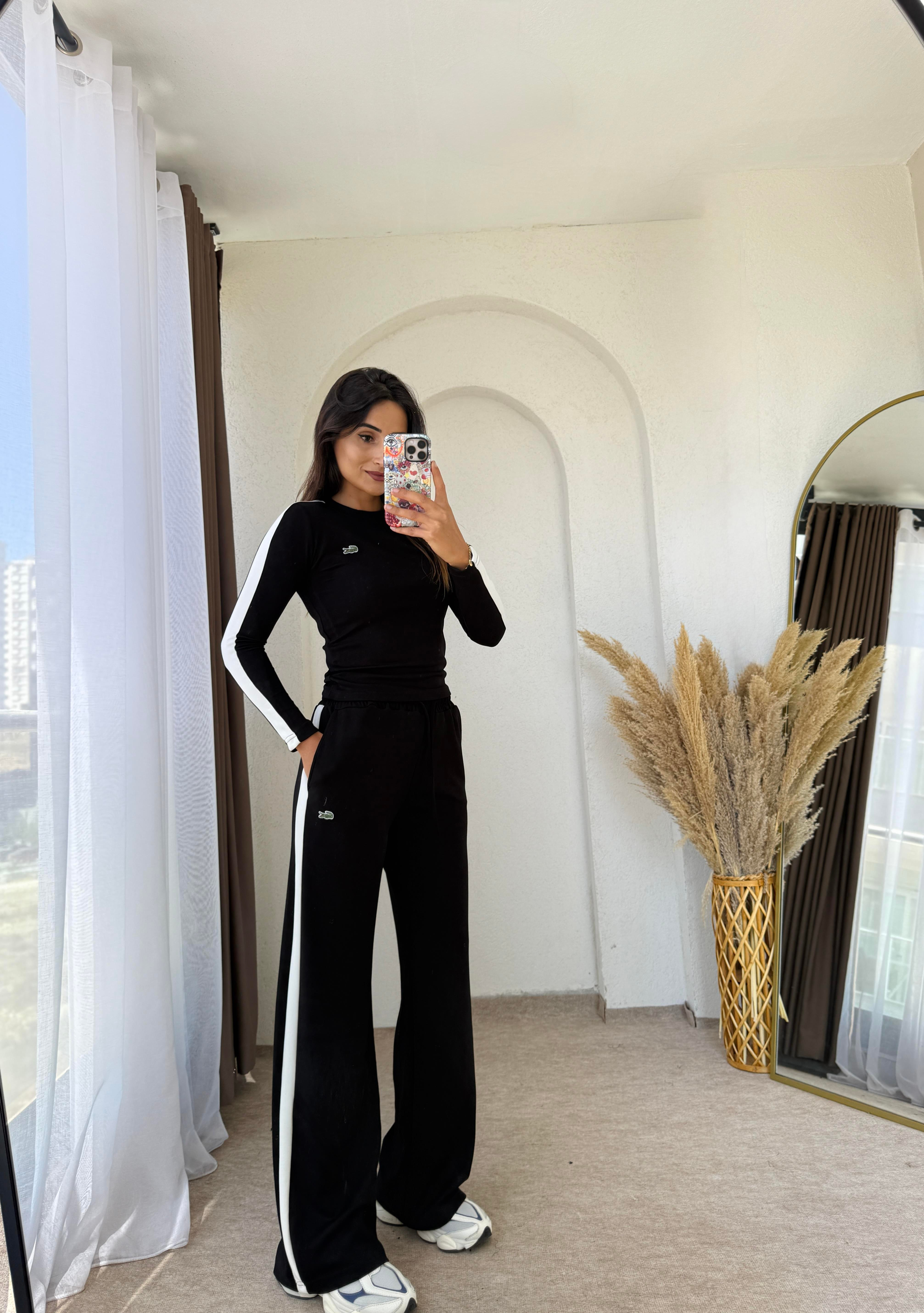 Modal kumaşa sahip eşofman takımı alt şerit detaylı yüksek bel beli lastikli yanları ceplidir üst sıfır yaka şerit detaylıdır Model 170/60kg çekimde S beden kullanılmıştır