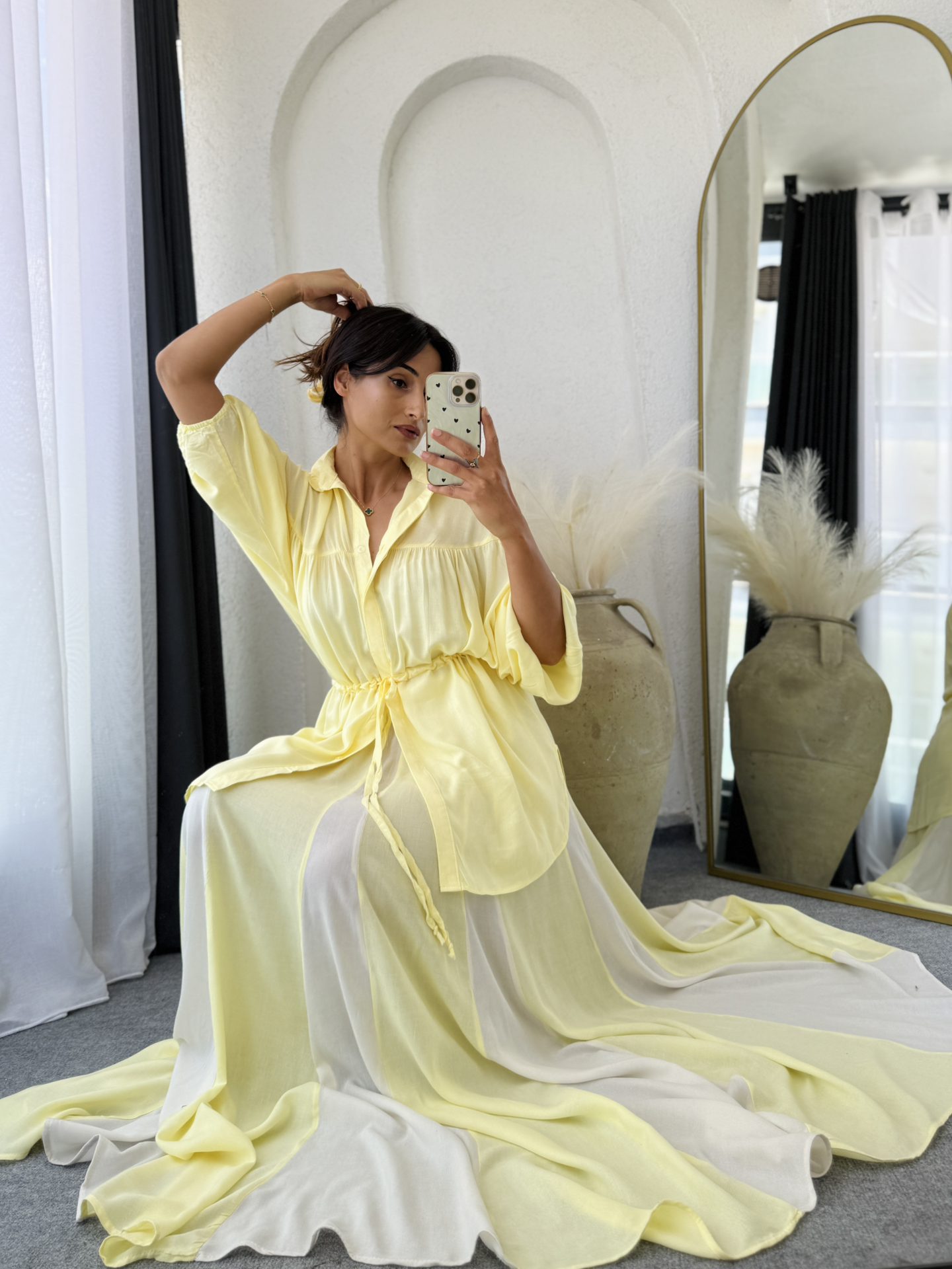 Sezonun soft sarı rengi pamuklu kumaş volanlı renk geçişli beli lastikli eteği ve belden büzgü detaylı kolları balon kol gömleği ile mükemmel takım, %100 pamuklu marka modeliyle hem rahat hem de şık bir tarz sunuyor. Günlük kullanıma uygun bu takım, özgün tasarımı ile dikkat çekiyor. Herkesin favorisi olmaya aday!