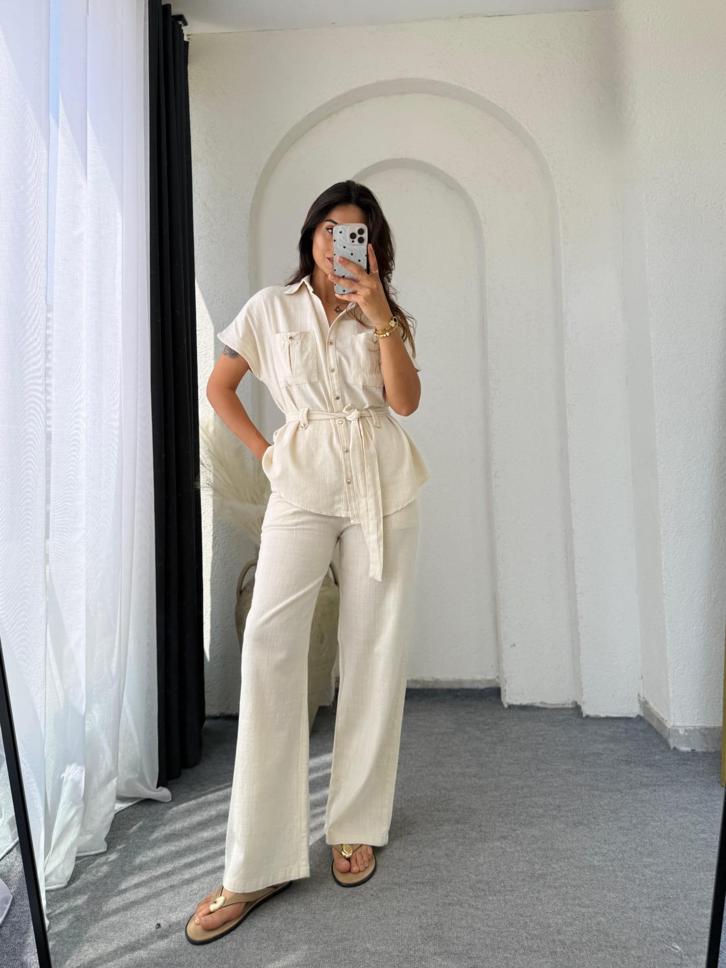 nefes alan ham keten kumaştan üretilmiş takım, sizi terletmeyecek ve rahatlıkla giyebileceğiniz bir seçenektir. Beli lastikli pantolonu , tonaton düğmeli ve kendinden kuşaklı olan gömleğiyle, şıklığı ve konforu bir arada sunar. Günlük kullanımınızda veya özel günlerde tercih edebileceğiniz bu takım, zarif ve modern bir görünüm sağlar.