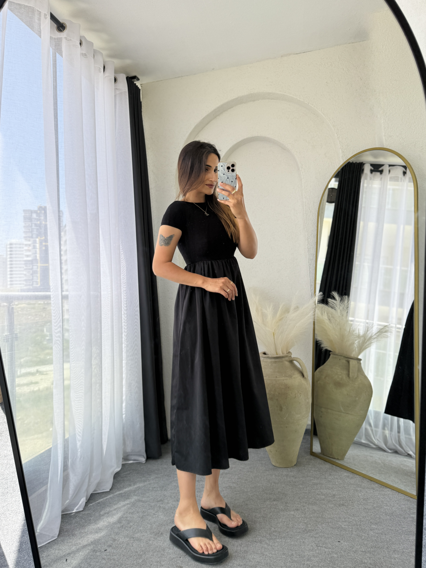 üst kısmı pamuklu kumaşından yapılmış olup, alt kısmı pamuk saten kumaştan üretilmiştir. Günlük kombinlerinizde rahatlıkla kullanabileceğiniz şık ve modern bir tasarıma sahiptir. Etek kısmı kloş bol kesimlidir ve hareketli bir görünüm sunar. Bu elbise, hem şıklığı hem de konforu bir arada arayanlar için ideal bir seçenektir.