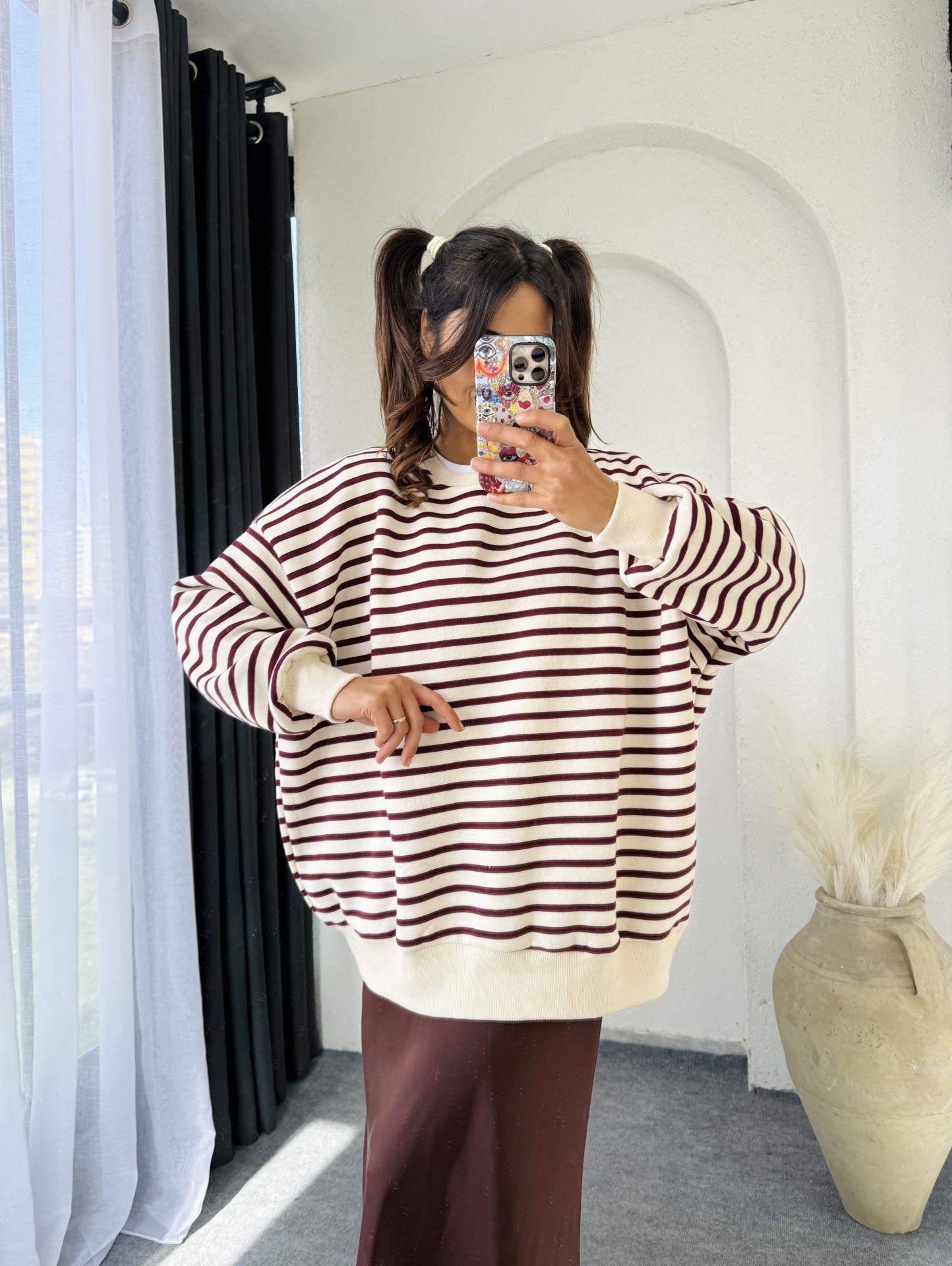 Premium kalite oversize kesim 3 iplik şardonludur krem üzeri bordo çizgilidir 44 bedene kadar uyumludur