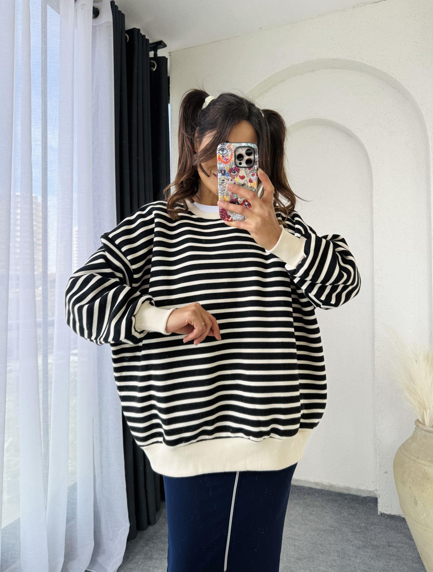 Premium kalite oversize kesim 3 iplik şardonludur krem üzeri siyahçizgilidir 44 bedene kadar uyumludur