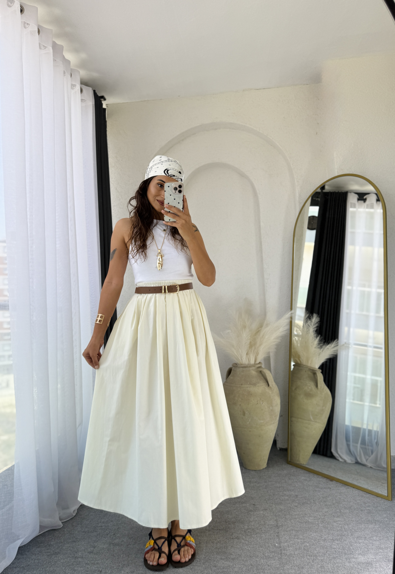 poplin kloş etek, beli lastikli ve yanları cepli olan pratik bir parçadır. Ön ve arka plise detaylarıyla hareket kazanan etek, hafif ve rahat poplin kumaştan üretilmiştir günlük kombinlerinizin parçası olmaya adaydır.