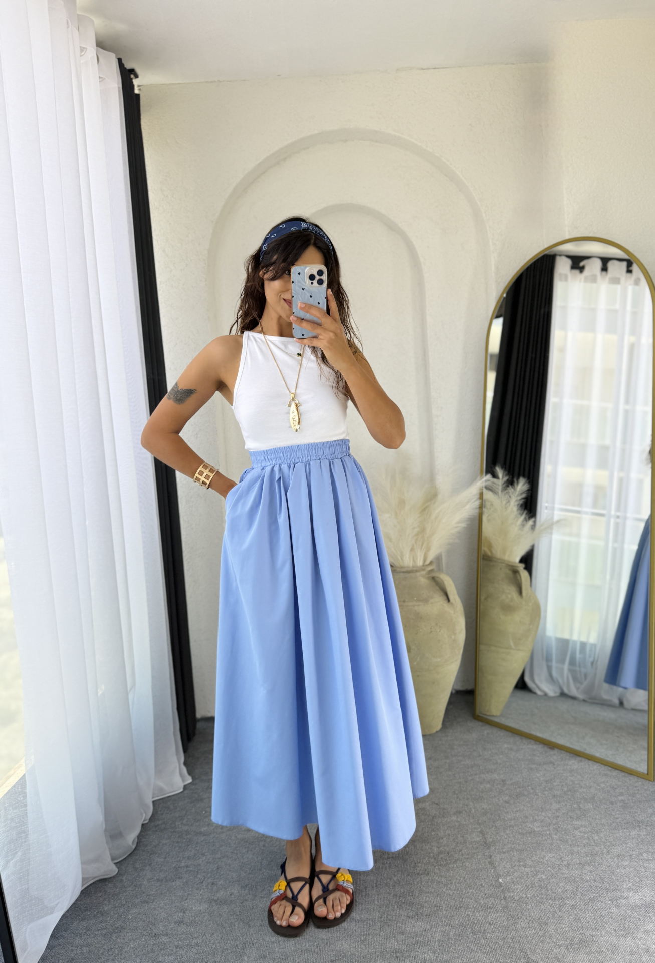 poplin kloş etek, beli lastikli ve yanları cepli olan pratik bir parçadır. Ön ve arka plise detaylarıyla hareket kazanan etek, hafif ve rahat poplin kumaştan üretilmiştir günlük kombinlerinizin parçası olmaya adaydır.