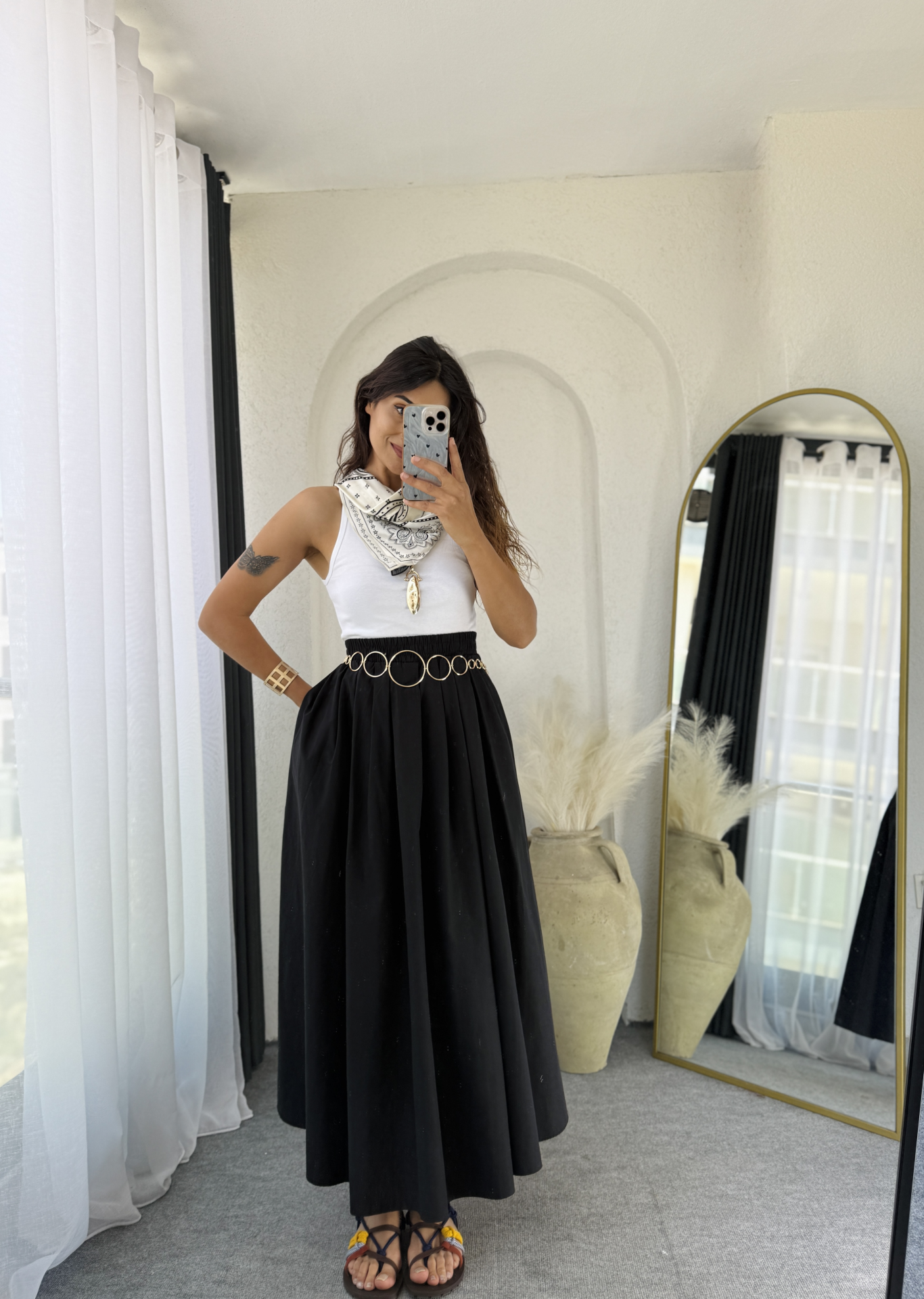 poplin kloş etek, beli lastikli ve yanları cepli olan pratik bir parçadır. Ön ve arka plise detaylarıyla hareket kazanan etek, hafif ve rahat poplin kumaştan üretilmiştir günlük kombinlerinizin parçası olmaya adaydır.