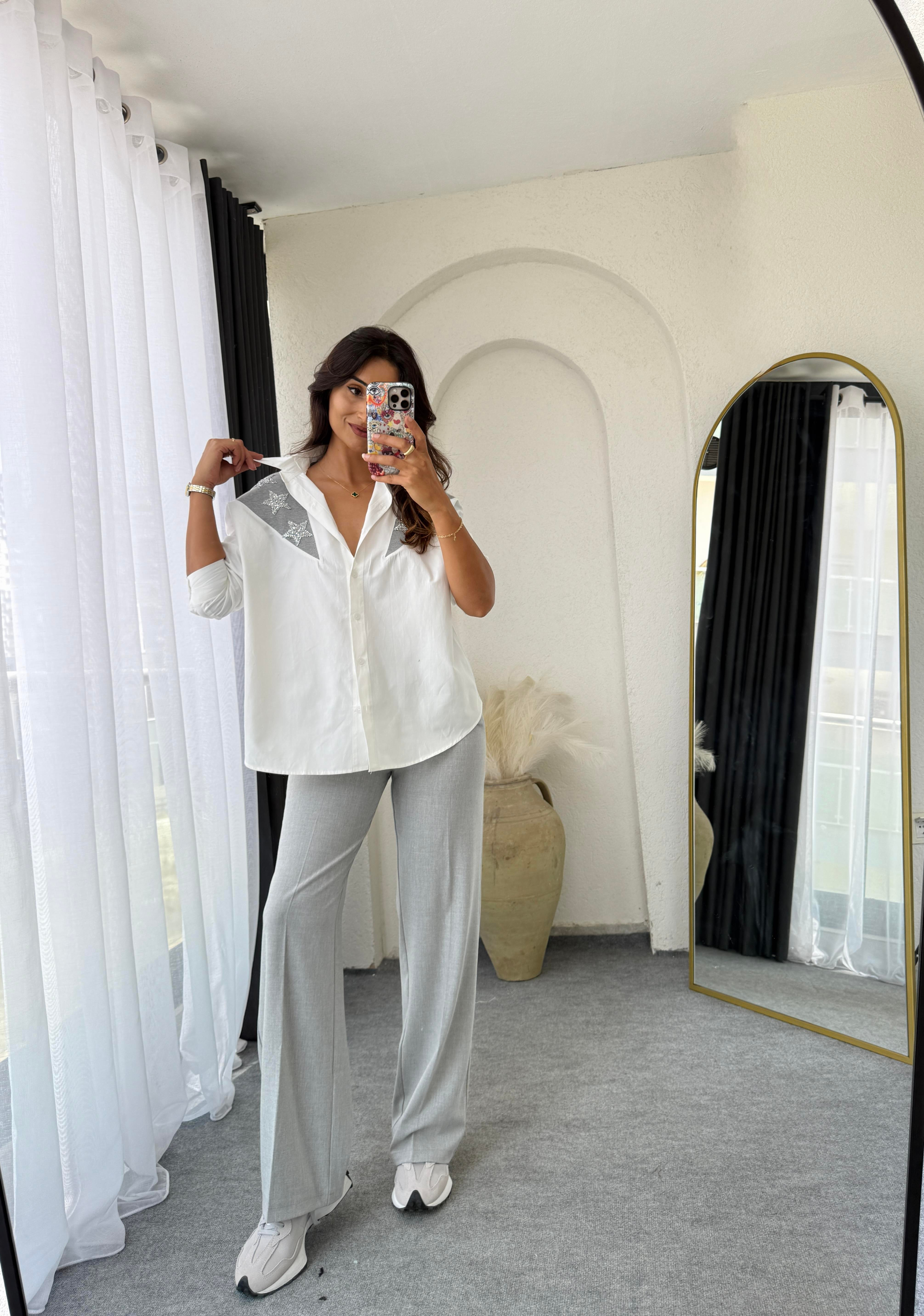 gömlek poplin kumaş oversize bol kesim yarasa kol omuzları triko detaylıdır üzeri taşlıdır