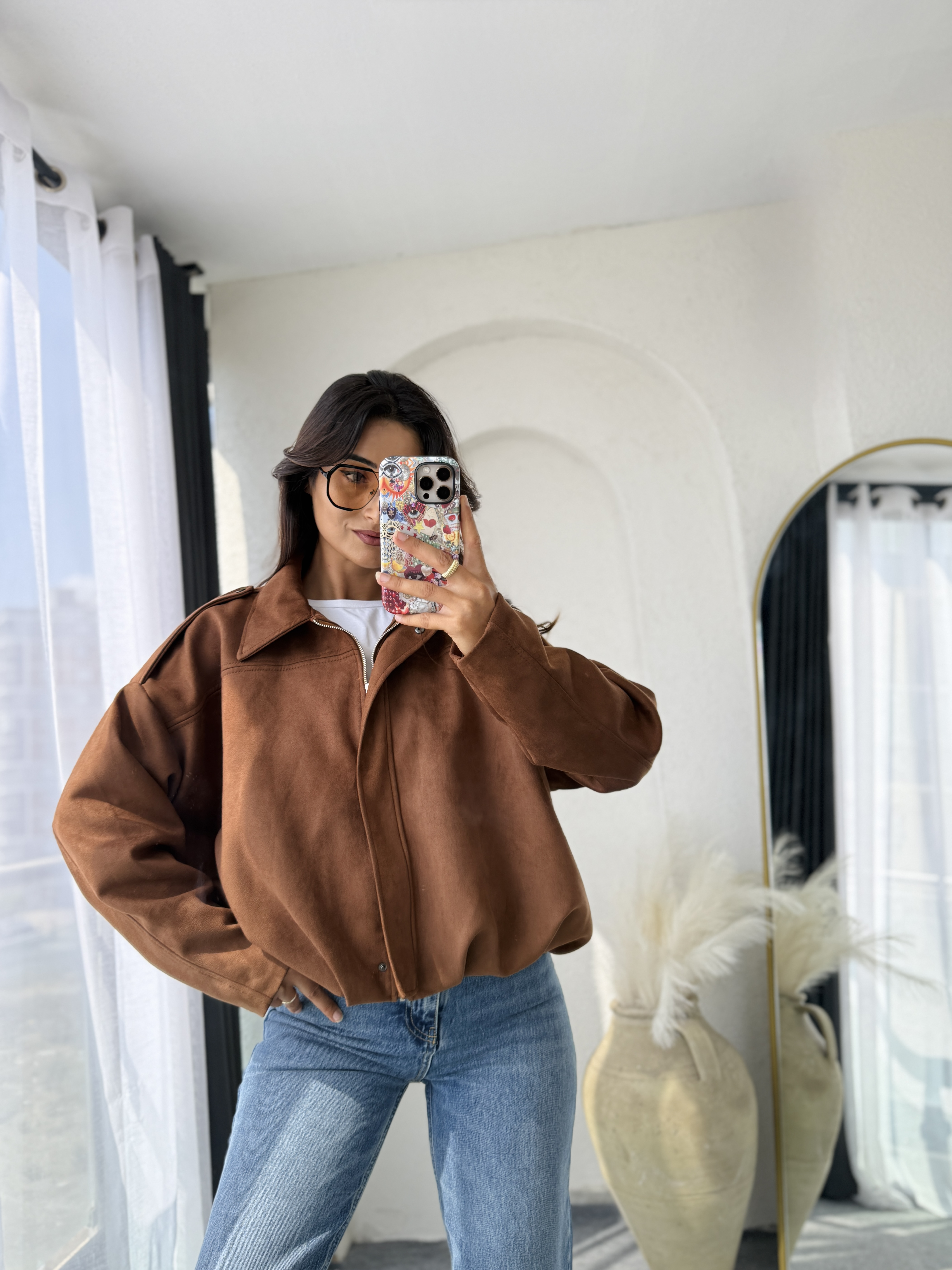Oversize kesime sahip trend cekette Yumuşak süet kumaş ile çalışılmış içi astarlı ve fermuarlıdır fermuarı gizleyen içten gizli çıtçıtlı kollar apolet detaylı bomber model