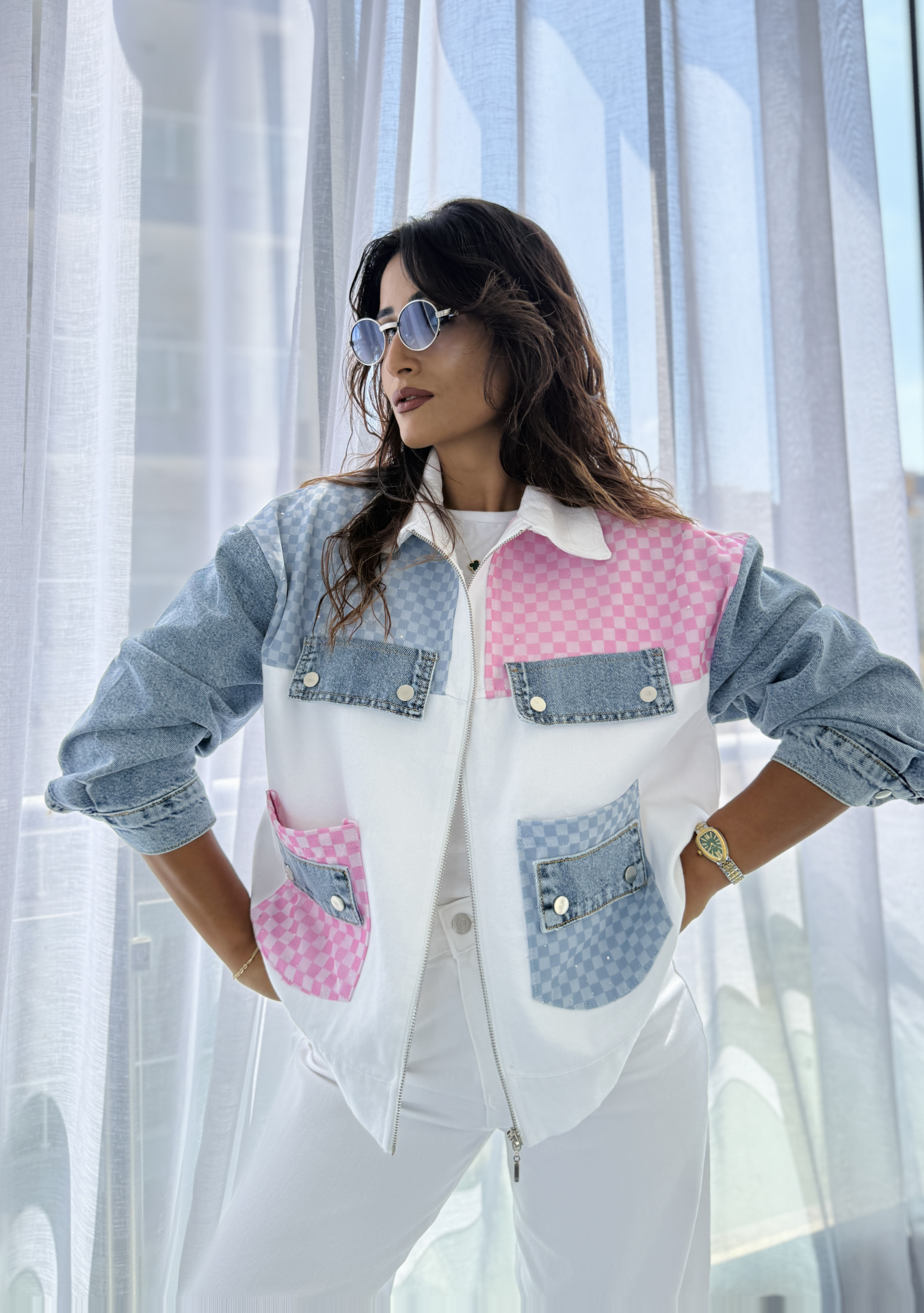 Kot kumaş tasarım model ceket oversize kesime sahip kolları balon formunda önde fermuar kapaması,  parıltılı simli tül detaylı softpembe ve bebe mavi parçalarıyla modeli ön plana çıkarıyor.