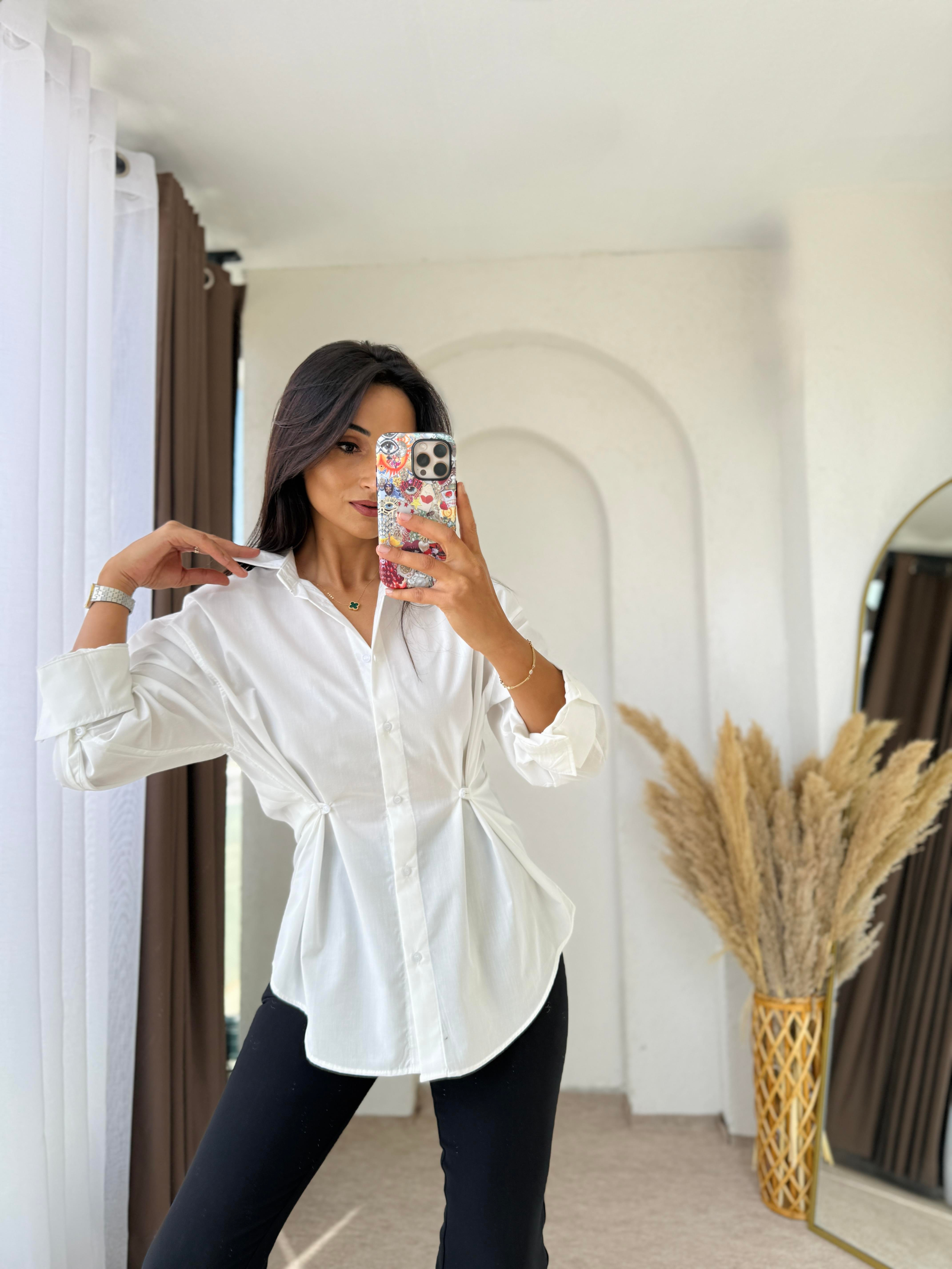 Poplin kumaş oversize kesime sahip tasarım gömlek, belde çift ilikleme düğme detaylı istenilen ölçüde dar yada bol kullanılabilir.Kollarda kalın manşet ütülü çift ilikleme düğme detaylı dar yada bol kullanılabilir. model 170/60kg çekimde S beden kullanılmıştır
