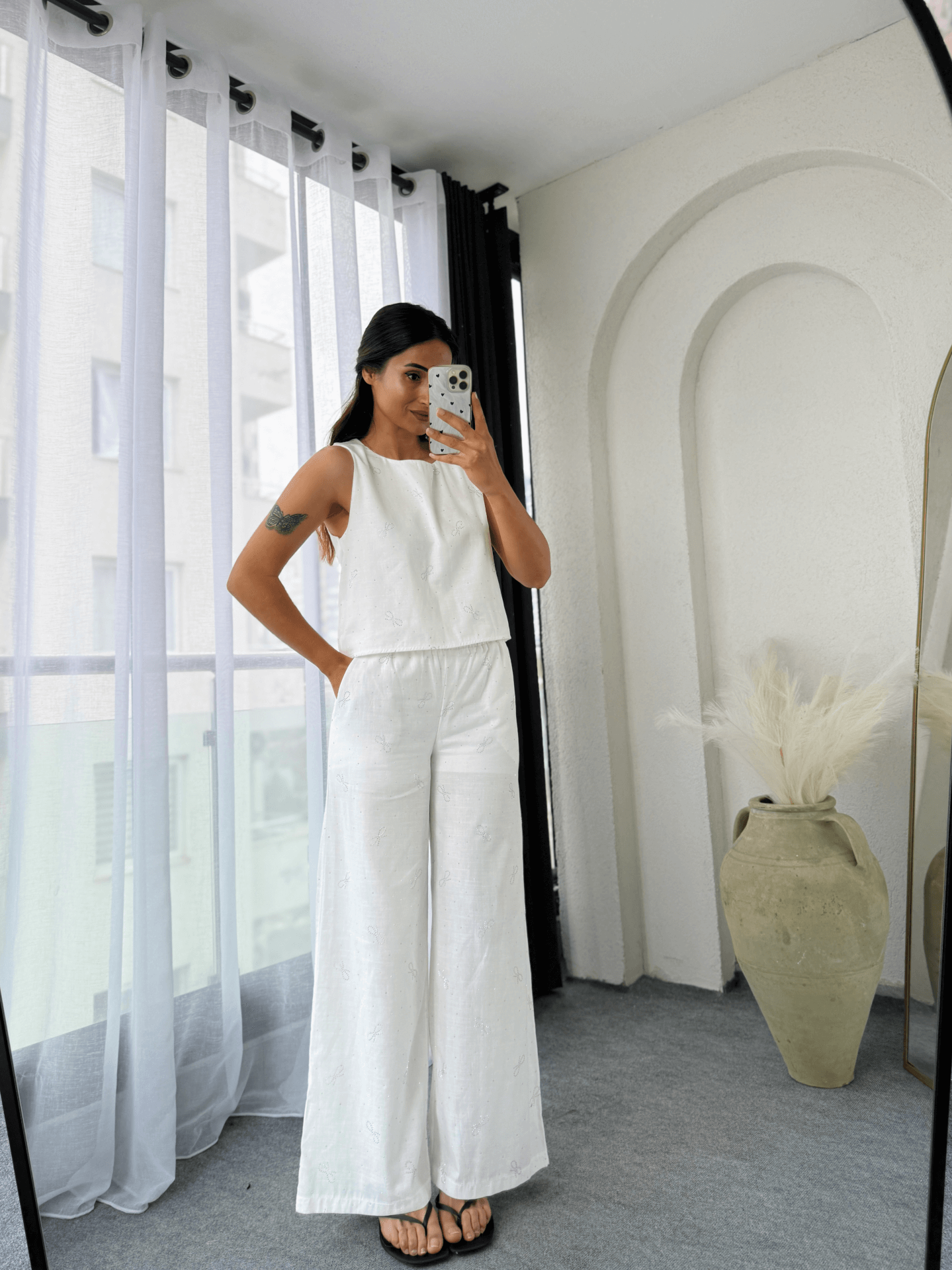 Bu muhteşem alt üst takım, pamuklu kumaştan yapılmış bir bluz ve alt pantolondan oluşuyor. Bluzun ensesinde şık bir pembe kurdele bağlamalıdır ve alt pantolonun beli lastikli ve ceplidir. Hem rahatlığı hem de şıklığı bir arada sunan bu takım, günlük kullanım için mükemmel bir seçenektir.
