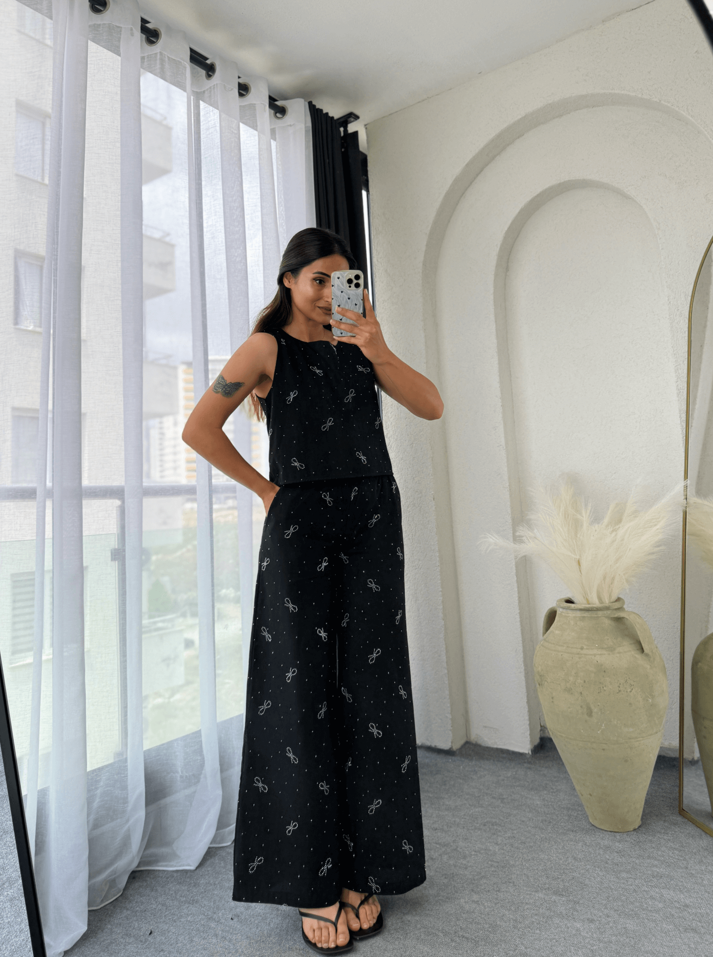 Bu muhteşem alt üst takım, pamuklu kumaştan yapılmış bir bluz ve alt pantolondan oluşuyor. Bluzun ensesinde şık bir pembe kurdele bağlamalıdır ve alt pantolonun beli lastikli ve ceplidir. Hem rahatlığı hem de şıklığı bir arada sunan bu takım, günlük kullanım için mükemmel bir seçenektir.