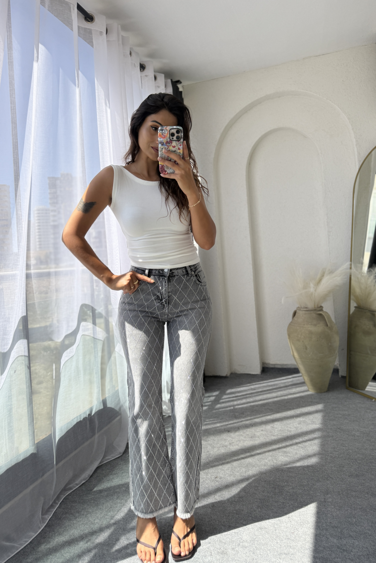 taşlı jean, günlük şıklık için idealdir. Flare kesim tasarımı ve paça kesik detayları ile dikkat çeker. Toparlayıcı tok jean kumaşıyla rahatlık sunar, aynı zamanda şık bir görünüm sağlar.