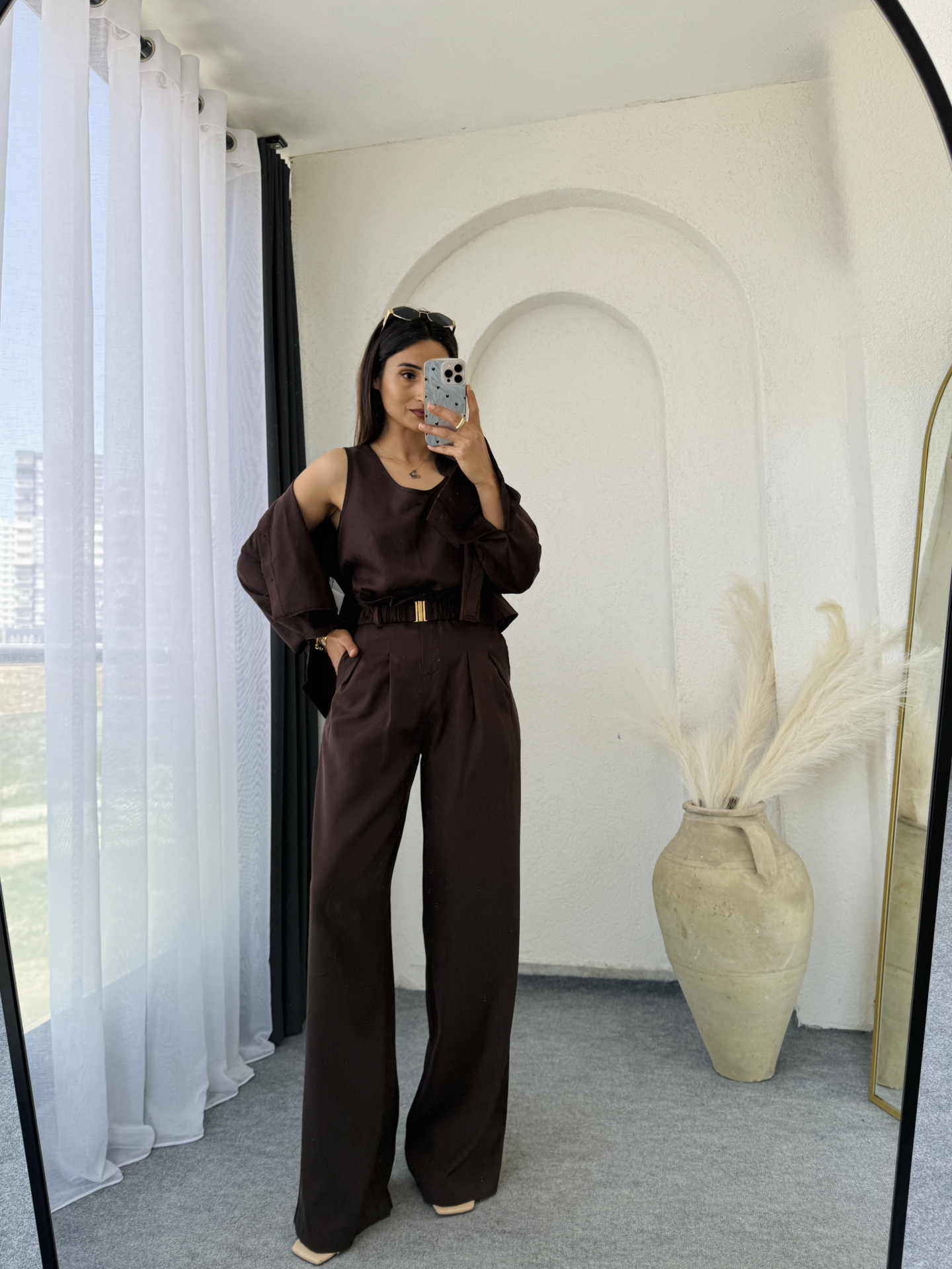 Tensel kumaş 3 parça takım, duble yüksek bel piliseli pantolonu,lastikli tasarım kemeri ve sıfır kol bluz ve gömleğiyle hem şık hem spor bir görünüm sunar.  Gardırobunuza şıklık ve rahatlık katacak mükemmel bir seçenektir.