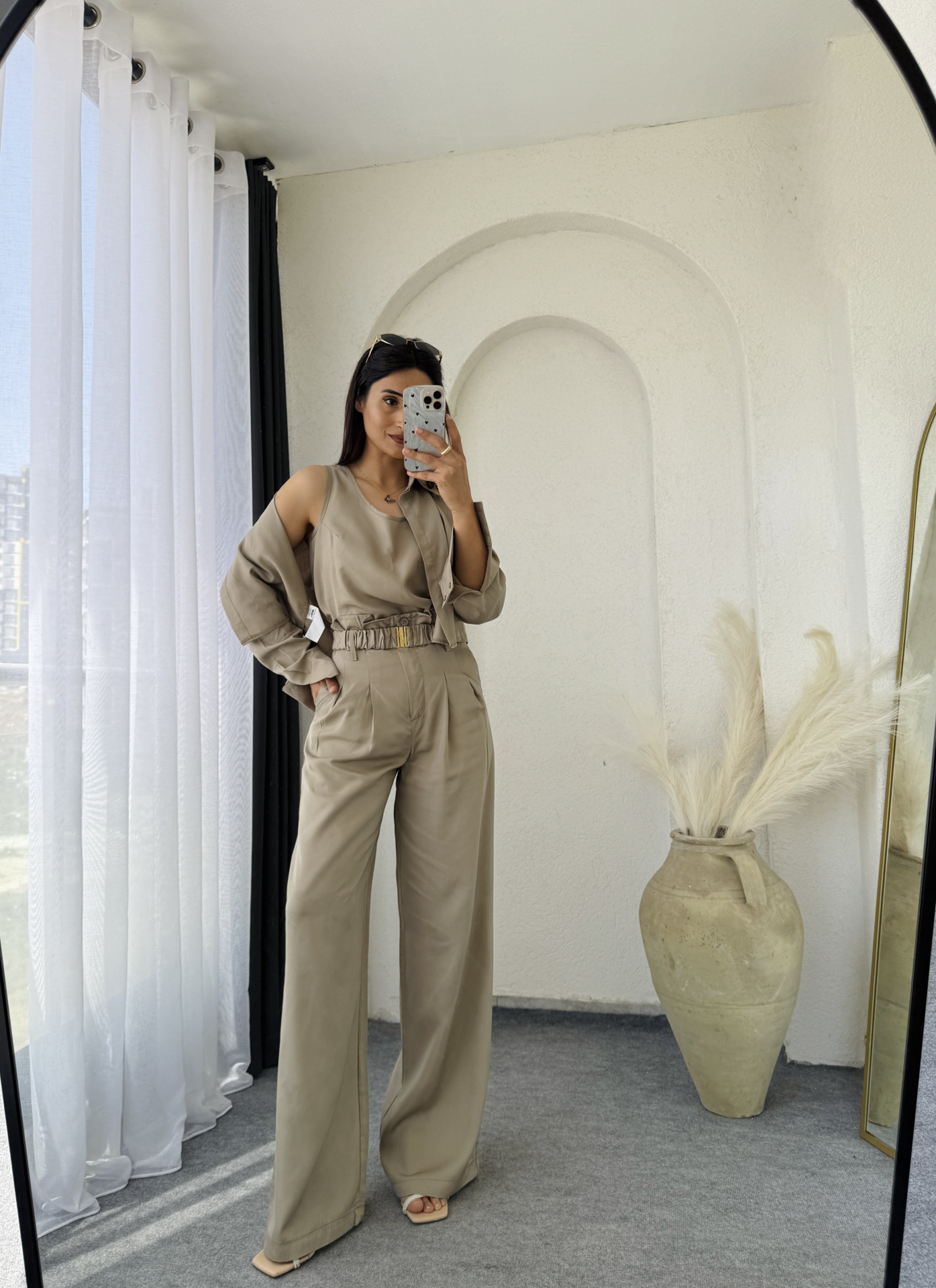 Tensel kumaş 3 parça takım, duble yüksek bel piliseli pantolonu,lastikli tasarım kemeri ve sıfır kol bluz ve gömleğiyle hem şık hem spor bir görünüm sunar.  Gardırobunuza şıklık ve rahatlık katacak mükemmel bir seçenektir.