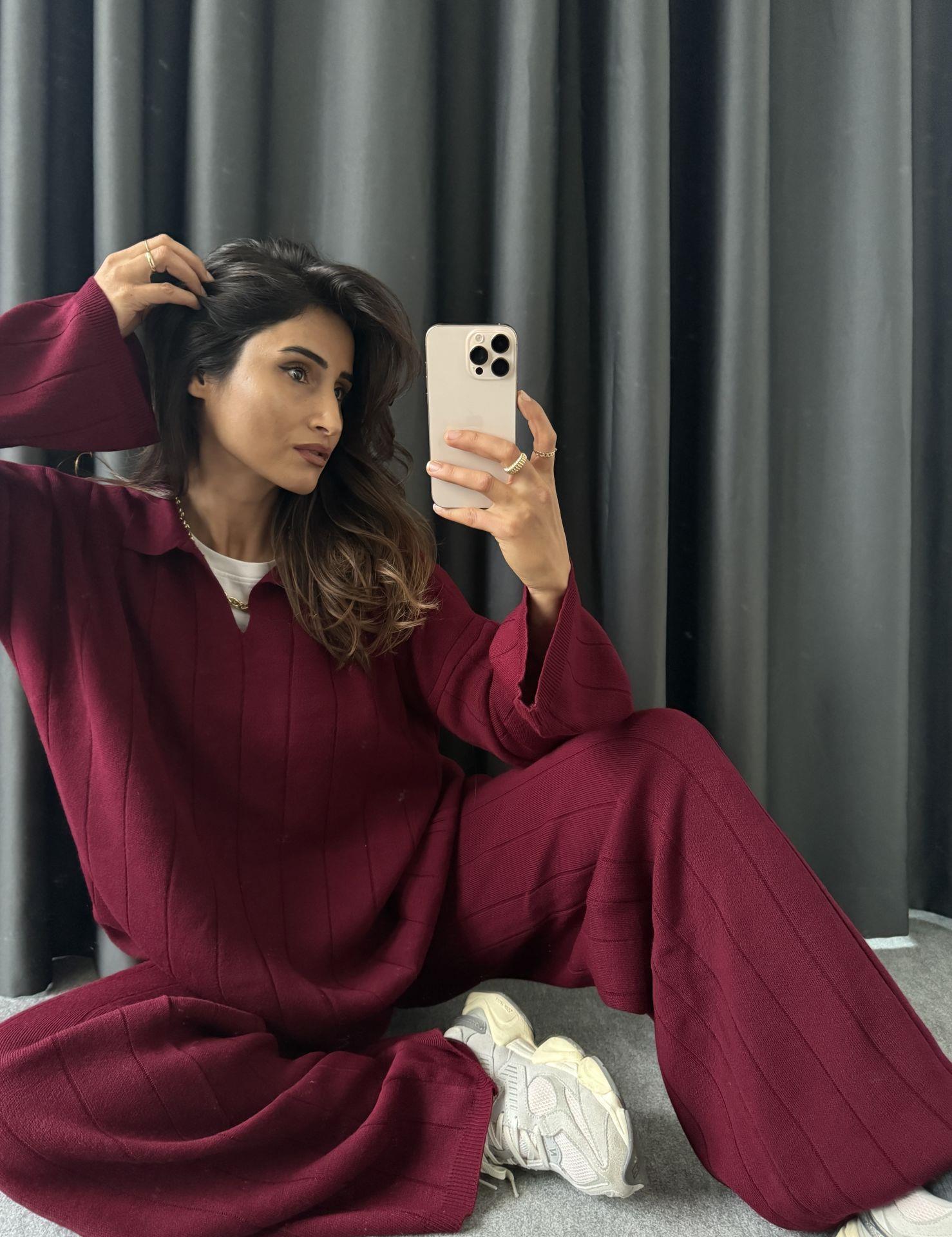 yumuşak tok dokulu triko kumaş enine boyuna likralıdır  pantolon yüksek bel beli lastiklidir uzunluk 117 cm üst oversize kesim İspanyol kol v yaka
