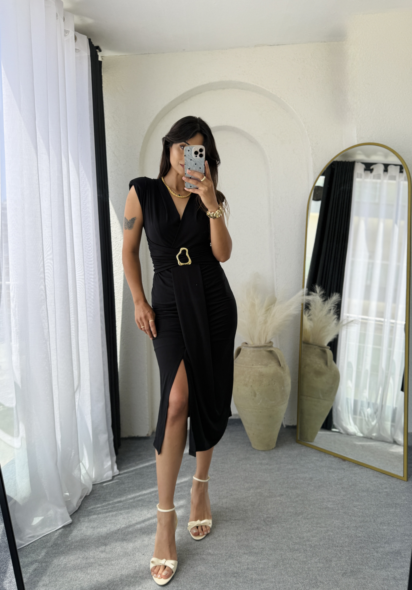 elbise enine boyuna  likralıdır, drapeli bel bölgesi ve kemer detayıyla zarif bir görünüm sunar. İçi astarlı omuzlardaki vatkasıyla, şıklık ve rahatlık bir arada sunuluyor. Her türlü özel davet için mükemmel bir seçenek!