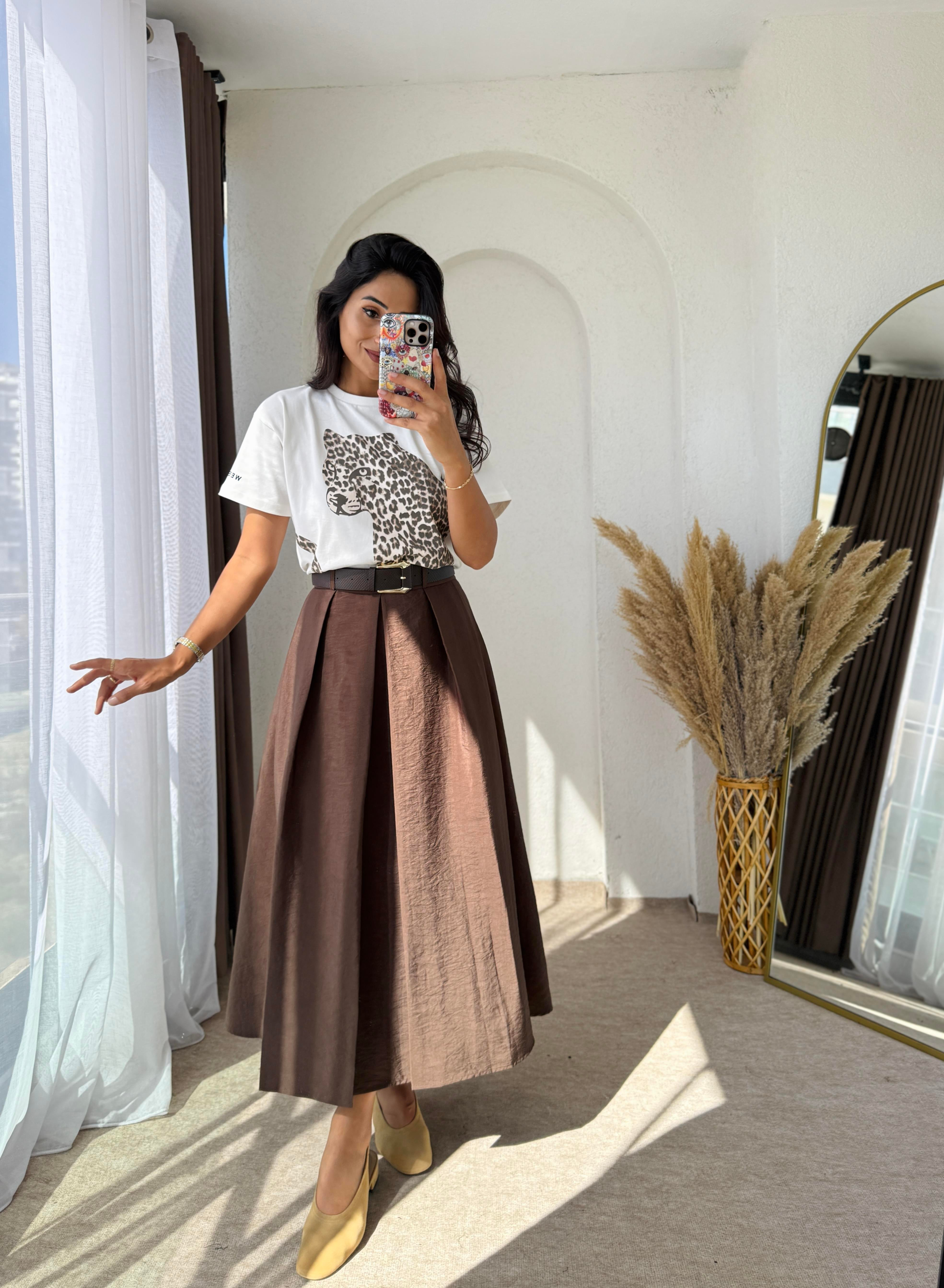 Cupra kumaşa sahip viral zara etek duble yüksekbel arka fermuar kapamalı kahverengi gold tokalı kemerlidir ön pilise detaylı arkası pilisesizdir rahat kalıba sahip