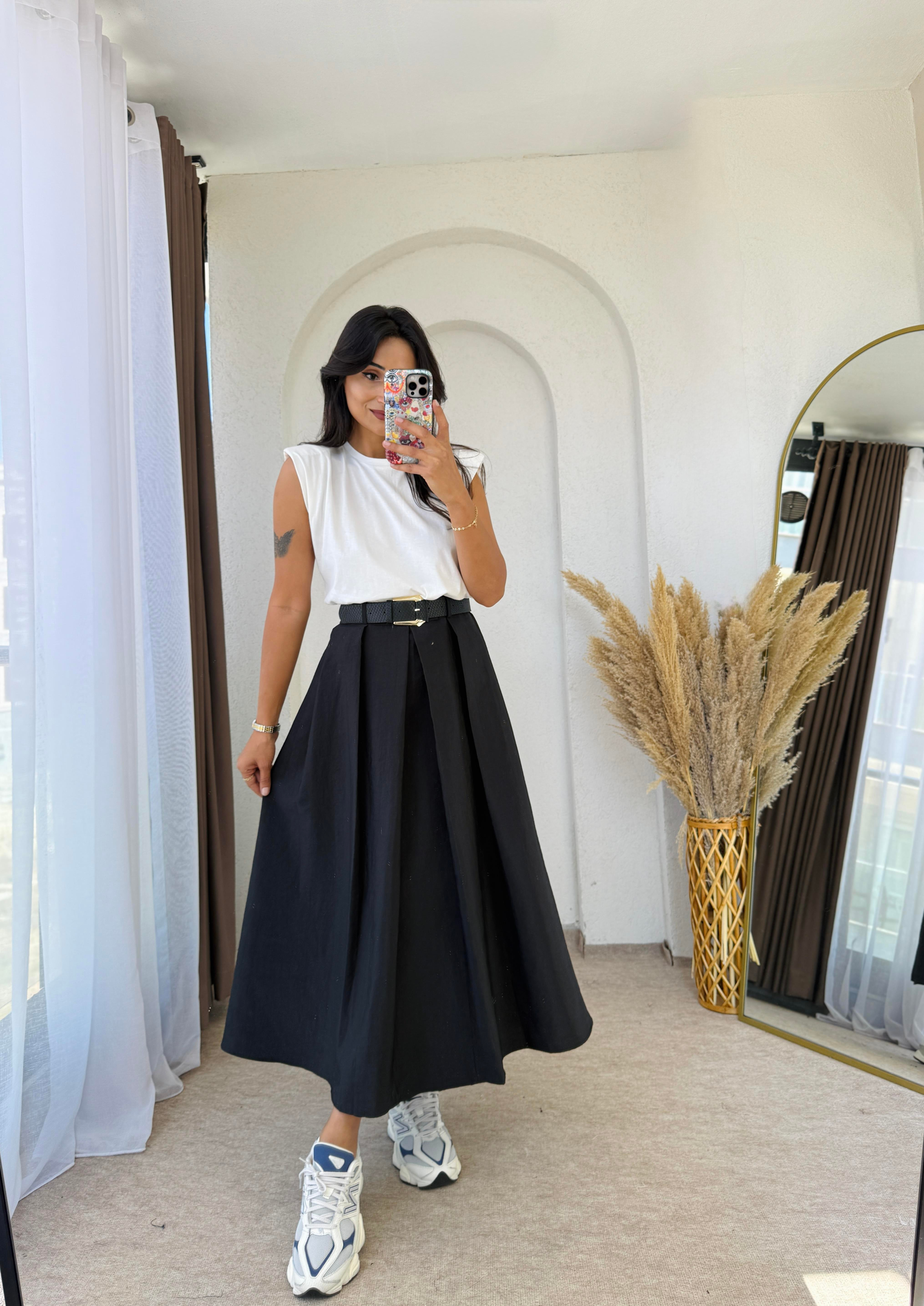 Cupra kumaşa sahip viral zara etek duble yüksekbel arka fermuar kapamalı siyah gold tokalı kemerlidir ön pilise detaylı arkası pilisesizdir rahat kalıba sahip