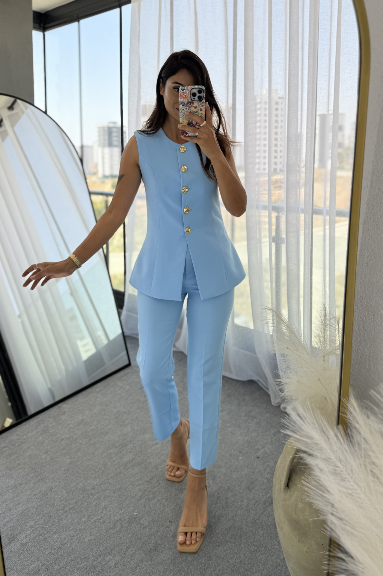 Duble atlas kumaştır, yelek, içi astarlı omuzları vatkalı bel kum saati görünümlü etek ucu kloş kesimdedir gold düğme detayı ile tamamlanmıştır.Pantolon bilek boy kesim yüksekbel tek pensli yanları cepli ve likralıdır