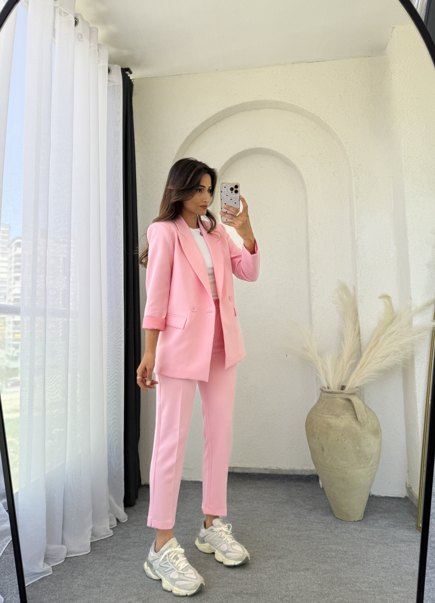 Bu zara blazer takım elbise, şeker pembesi tonuyla sezonun trend rengini yansıtıyor. Duble atlas kumaşıyla kaliteli bir dokuya sahip olan bu takım elbise, hem ofis hem de günlük hayatta şık ve modern bir görünüm sunuyor. Kusursuz tarzınızı tamamlamak için ideal bir seçim!